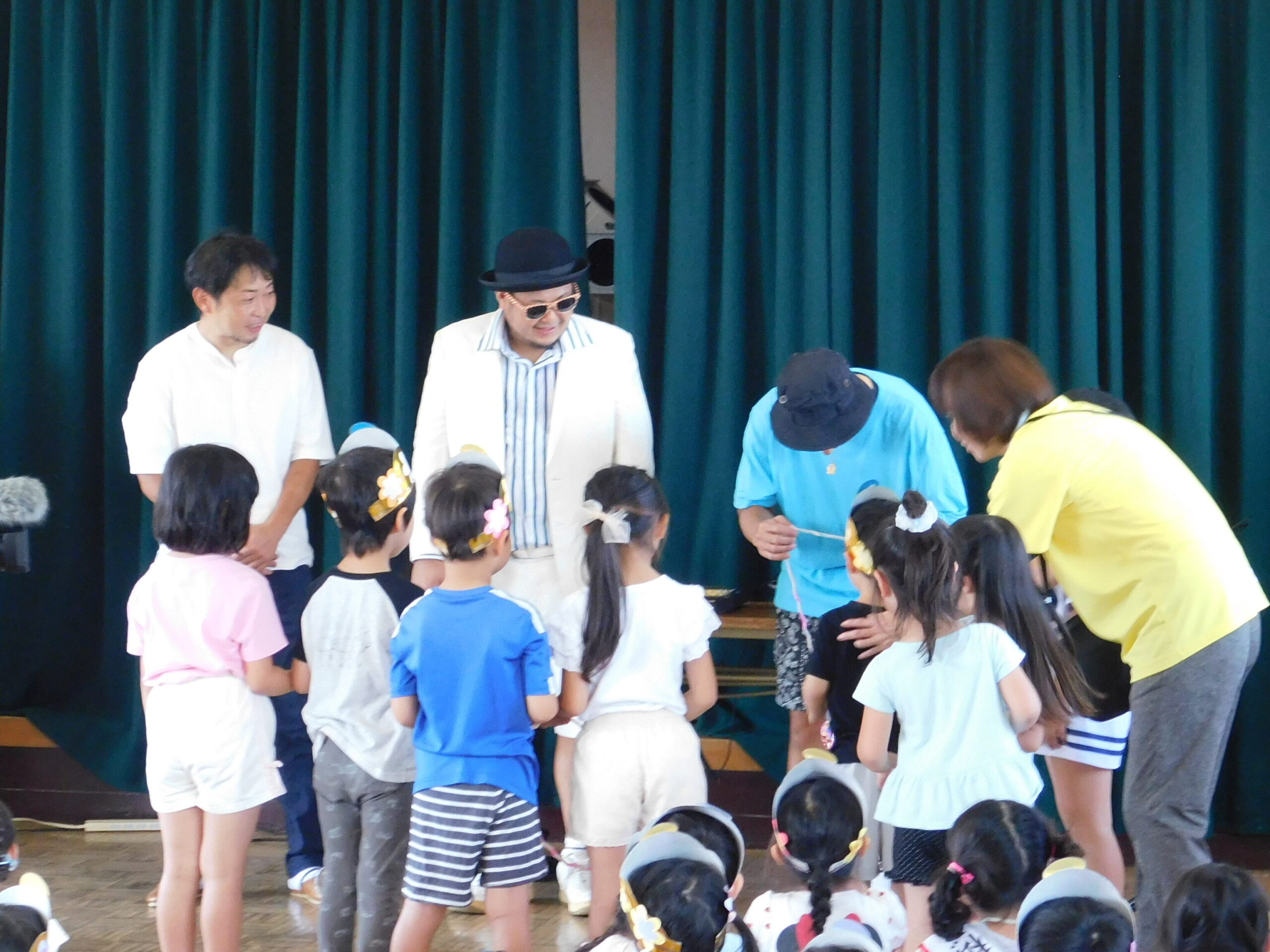 今日は8月生まれの誕生会を行いました。誕生児20名でしたが1名お休みの19名です。夏ならではの質問に元気よく答えてくれました。「浴衣を着た人!」ではたくさんの子が「はーい💕」と手を上げアピール。さて、今回は素敵なゲスト半田市出身ミュージシャン♪モンガマエリコーズさんらをお招きし、誕生日会を盛り上げてくれました。曲はGENさんオリジナル「ひとりじゃない」で始まり「夢をかなえてドラえもん」「ユーミンの飛行機雲」「尊軌とわ」最後に「同胞園歌」を全員で合唱しました。遊戯室はライブ会場さながらの熱気とGENさんのマイクパフォーマンスで楽しく過ごすことができました。GENさん=山元みのりさんのお父さんです。本日の様子はcAcにて放送されます。放送日8月22日(金)17時 当日再放送20時、22時、23時45分