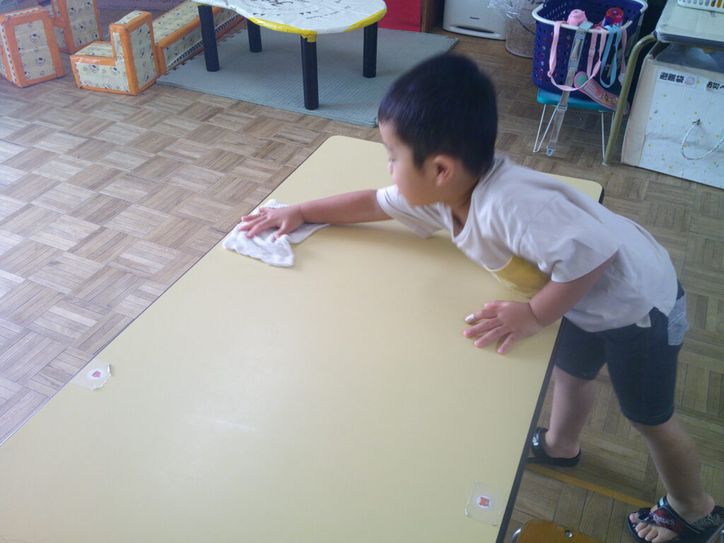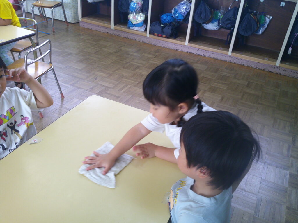 年少さんは今月から給食の当番活動を始め、机を拭いたりコップを配ったりしています。夏の縦割り保育の時に年長さんが当番をしている姿をよく見ていた様でとっても上手に机を拭いてくれます。「お当番やってくれる子ー?」と聞くと「はい!」と手を挙げて毎日順番にお当番をしてくれる子どもたち!最初は2.3人でしたが、今では席に座った子から手を挙げてみんなが「やりたーい!!」と言ってやる気いっぱいです!