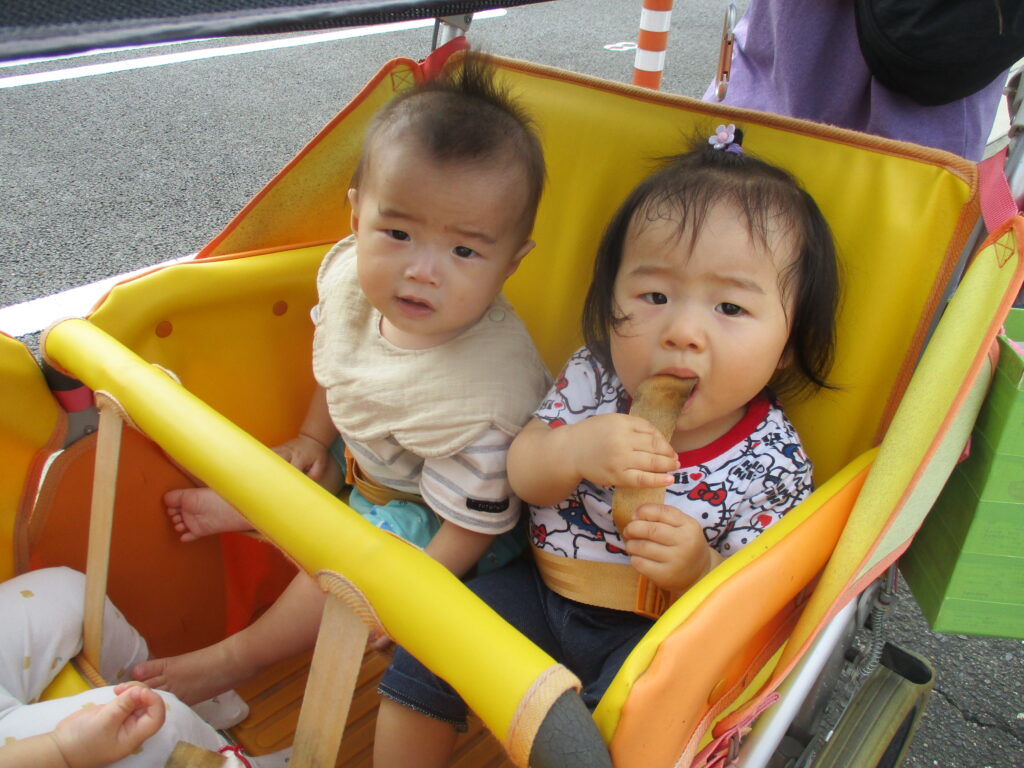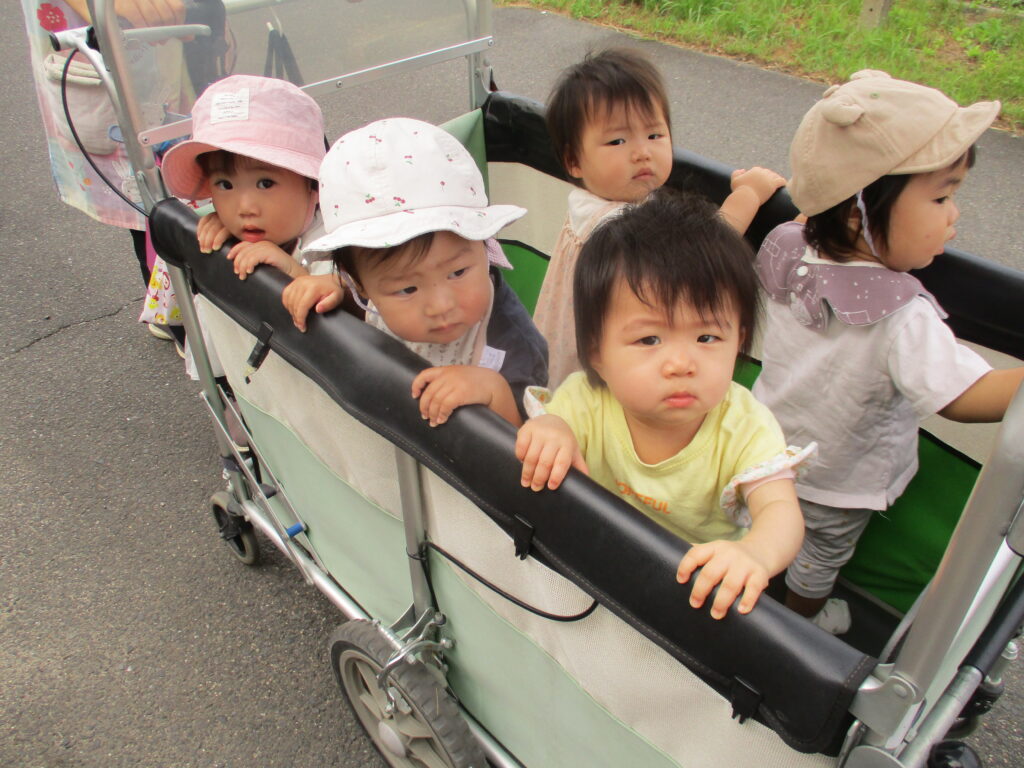 準備ができたらいよいよカートへ!座るタイプ、つかまり立ちするタイプ、ベビーカー…とその子に合わせたカートに乗っています。歩ける子も徐々に増え、靴を履き歩いての散歩も楽しんでいます♪