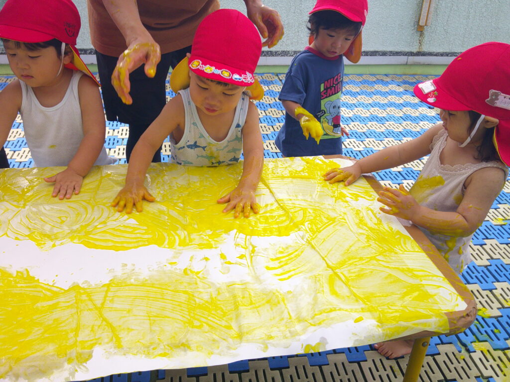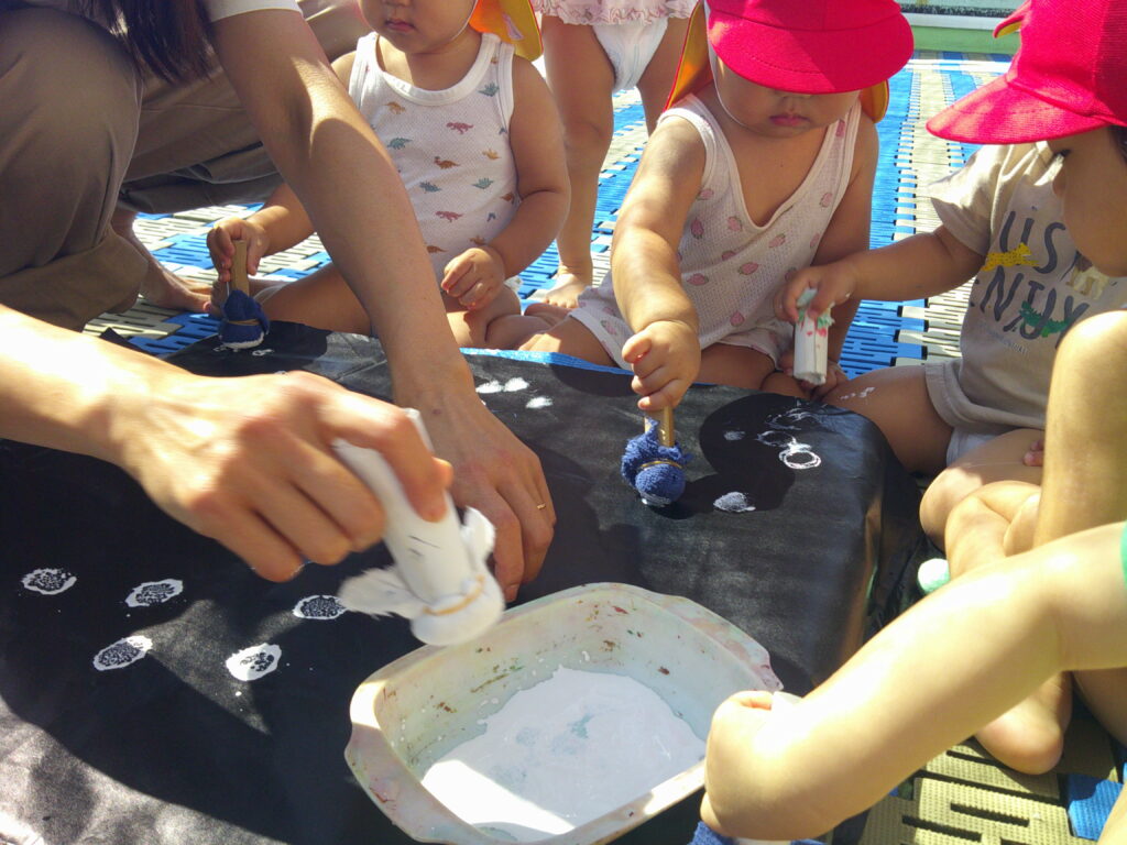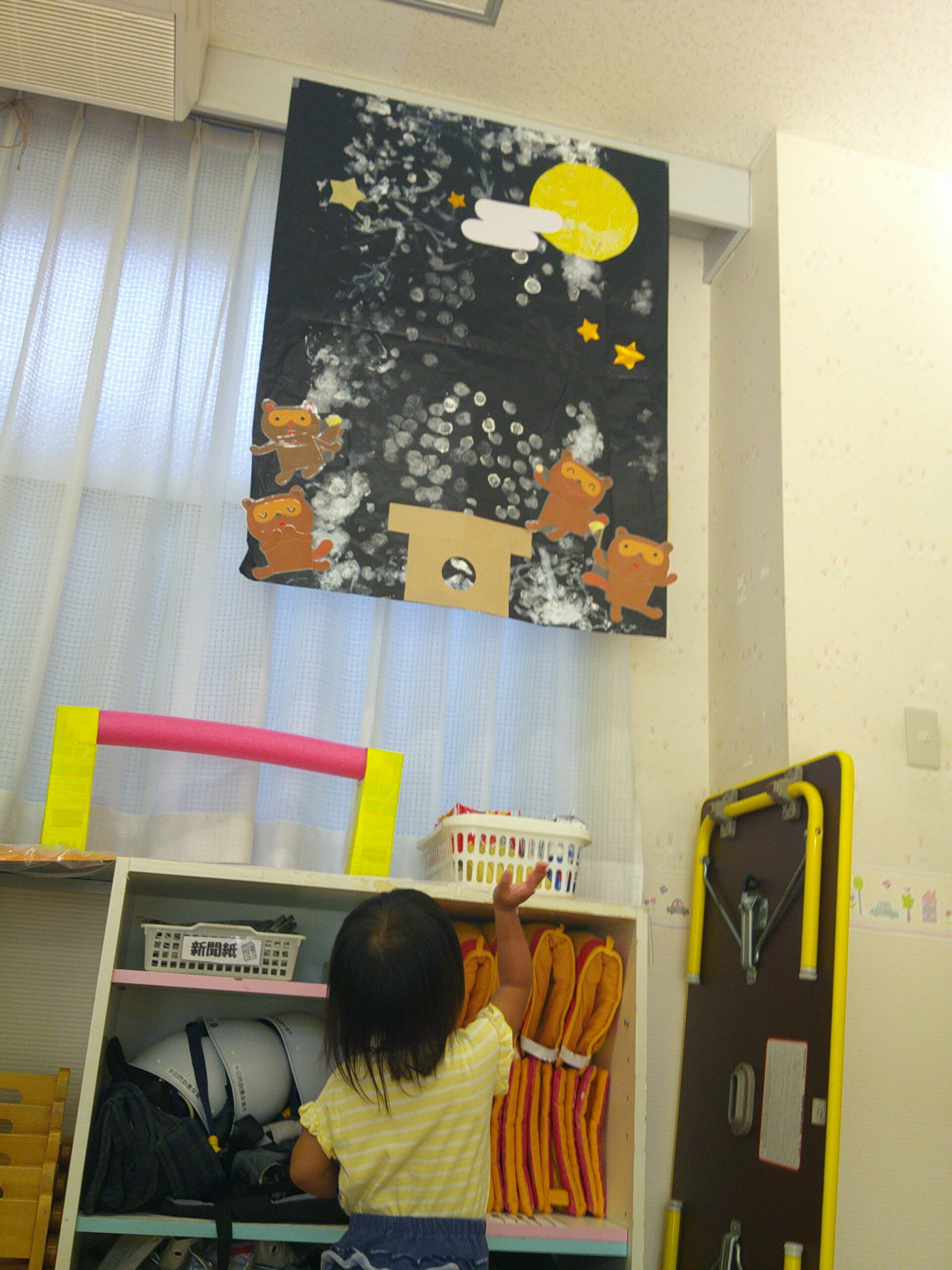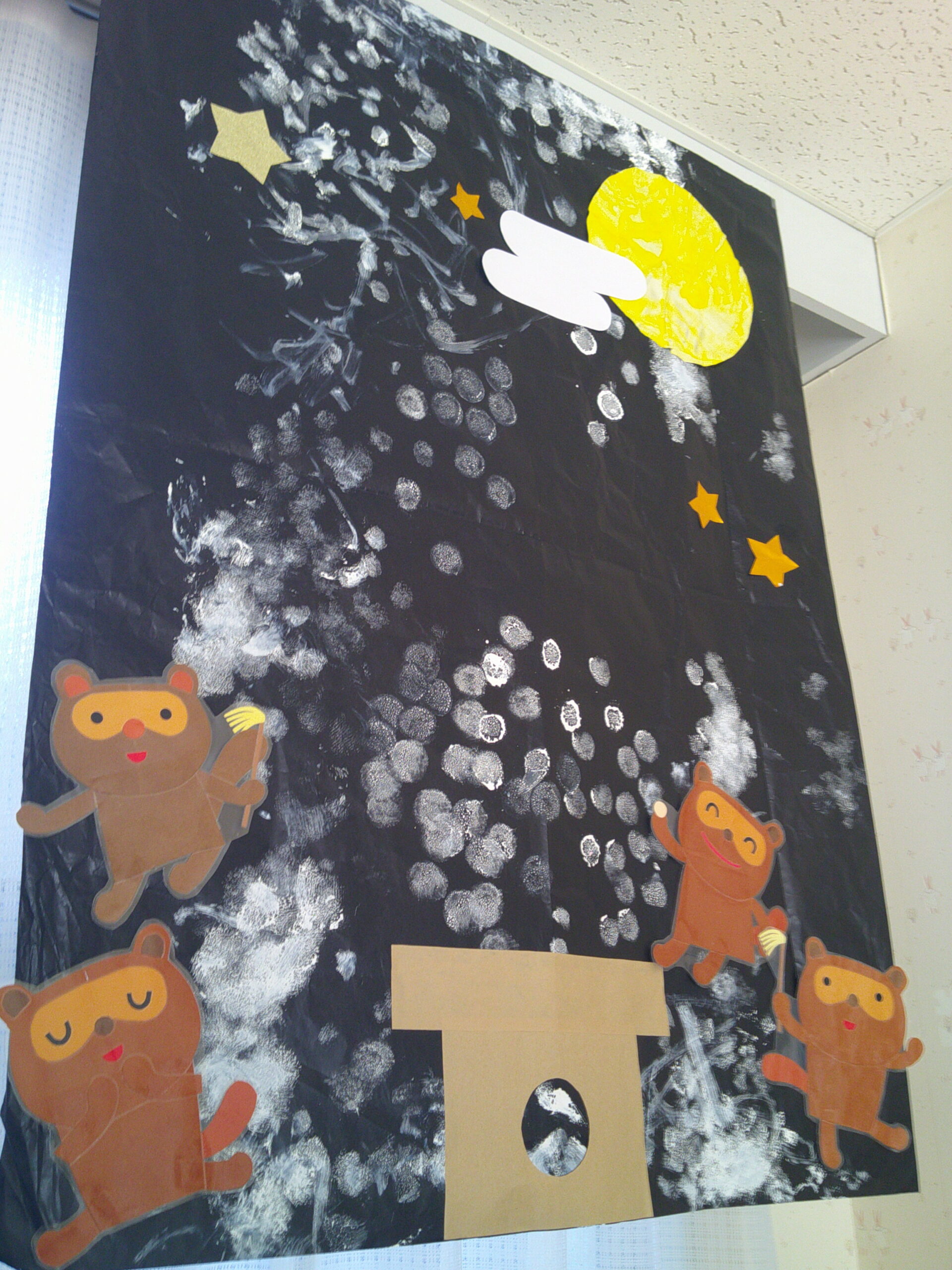 「ぽんぽこぽん!ぽんぽこぽん!~♪」と、❝ぽんぽこたぬき❞というお月見の手遊びを楽しみ、9月の終わりにお月見団子製作を行いました。にタンポに白い絵の具を付け、大きな黒い紙にポンポンと自由に押してお団子を表現!紙いっぱい、あちこちにお団子が出来上がりました。夏の感触遊びで作ったお月様を飾り、たぬきも飾り、お月見壁面が完成しました♪その日から、「おつきさま~~!」と壁面に向かって手を振るかわいい子どもたちです♡