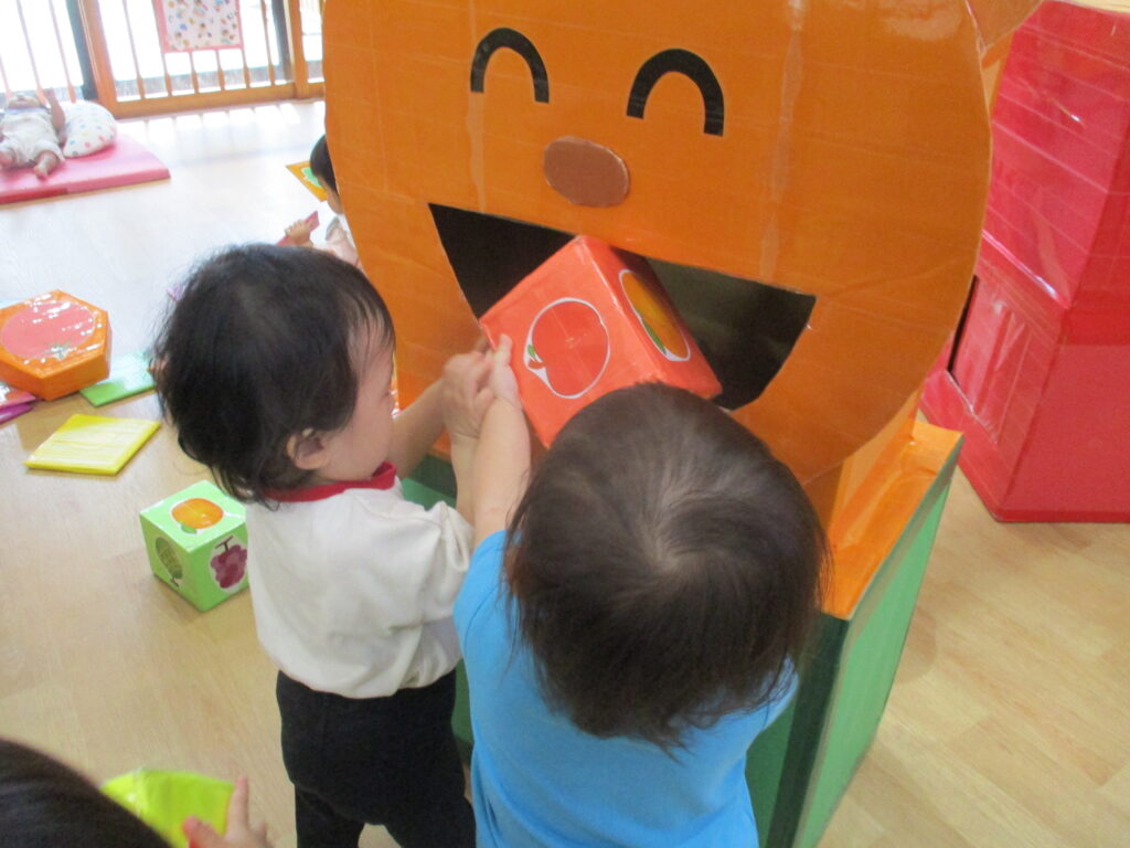 ひよこ組では、最近お片付けごっこを行っています!先生たちの「ないないだよ~」と言う声で箱におもちゃがしまえるようになってきて、その活動から運動会では動物さんのお口にフルーツを運びます。フルーツを2つ3つ抱えて頑張って運ぶ姿もあり、とってもたくましいです😊
