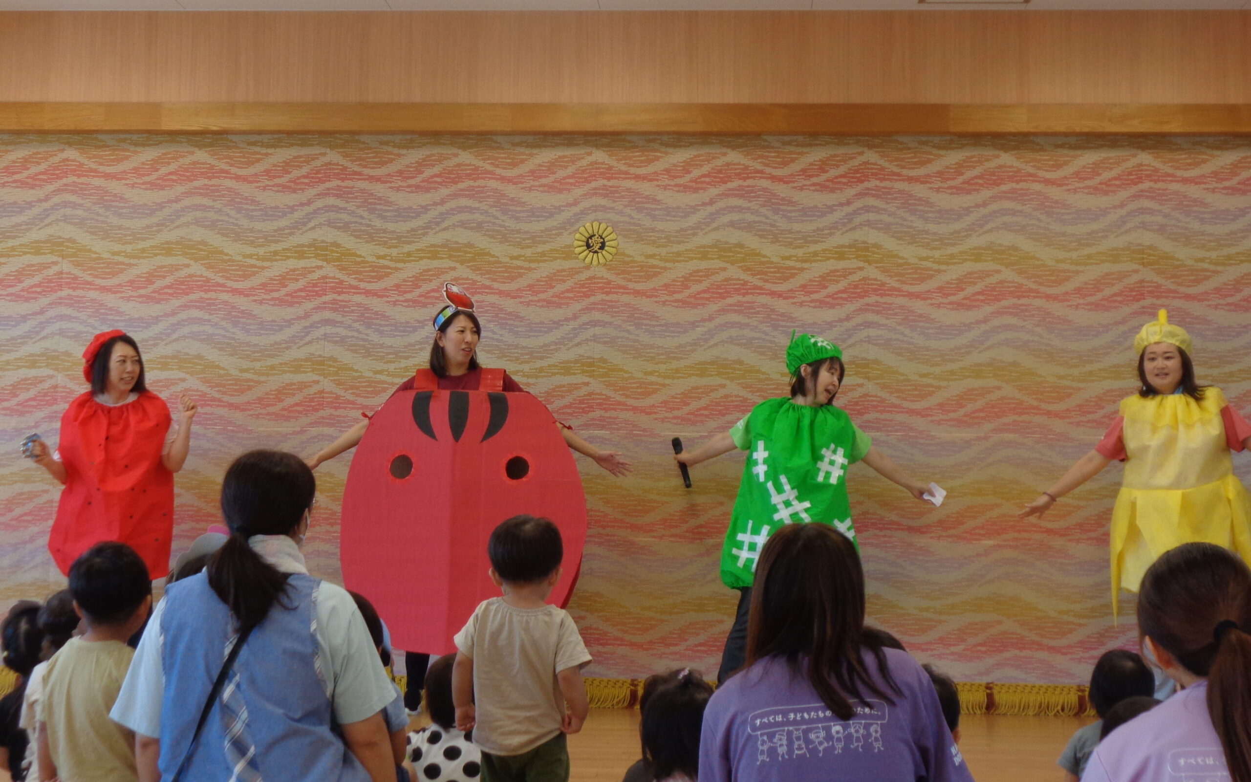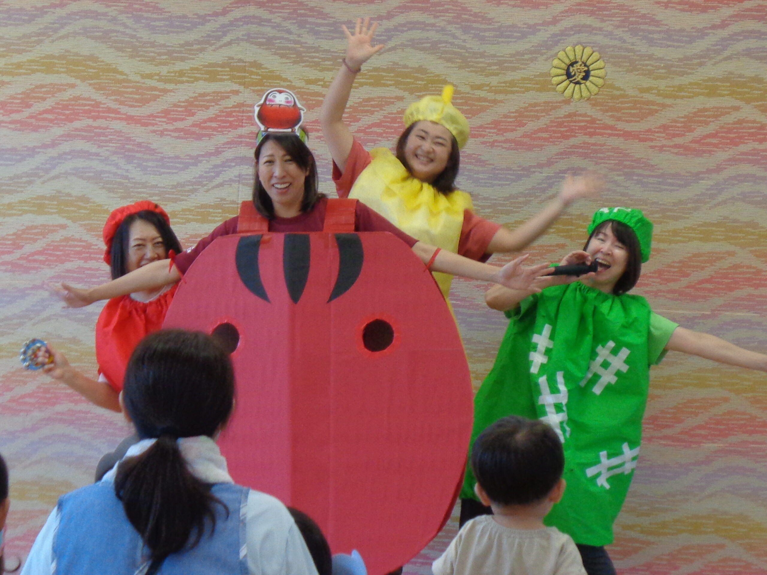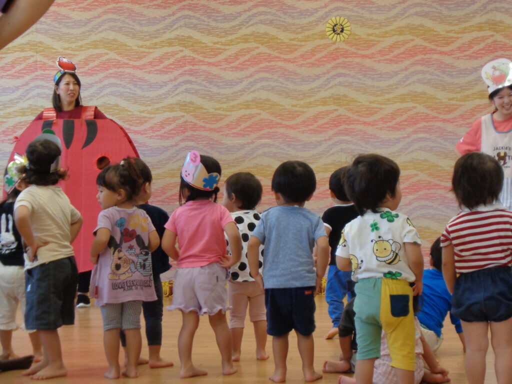 職員の出し物は『だるまさん』 先生たちがだるまさんやいちごに変身して、「だ~る~ま~さ~ん~と」・・・と、よたよたよた・・・だるまさんがとても大きくて泣いてしまう子もいましたが、たいていの子はニコニコして見守ってくれていましたよ!