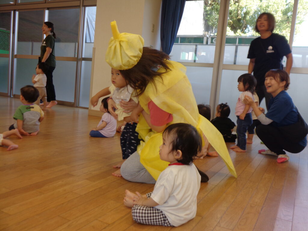 その後はみんなで体操、『フルフルフルーツ』を楽しんだ後、かけっこもやりました。2歳さんが走る姿に刺激された1歳さんは張り切って走っていました。0歳のお友達は走ったりハイハイしたり・・・。その様子をじっと見ていた2歳さんは、どう思ったのかな? 増々「僕たち、おにいさん!」という意識が高まったかもしれません⁈