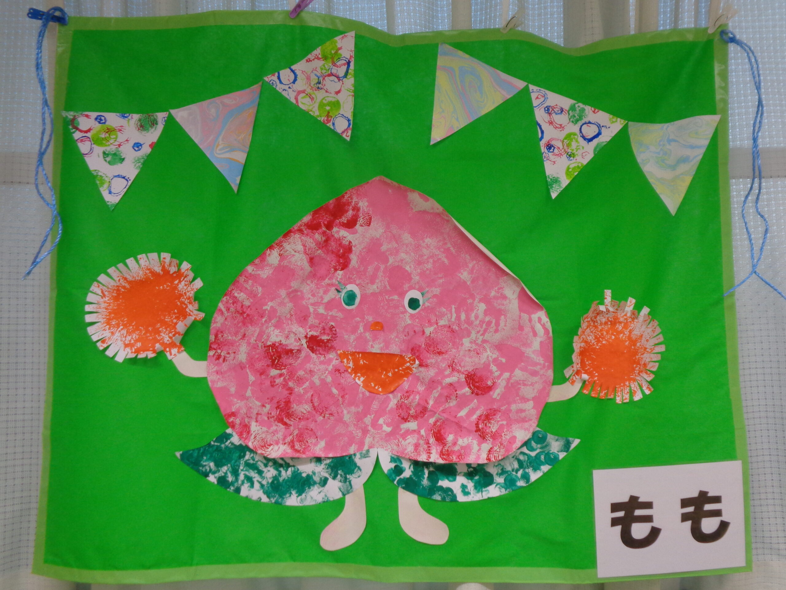 1歳児…夏のあそびで絵の具や野菜スタンプ、氷絵の具に煮片栗粉等いろいろな素材にふれて遊びました。興味津々でやってみようとしたり、初めてのことに少し戸惑ったり、色々な姿を見せてくれた子どもたち。そんな子どもたちの遊びの中で色付けしたものをクラスのフルーツに変身させ、応援旗を作りました。運動会ではかわいいフルーツちゃんたちも盛り上げてくれます。おたのしみに~♡