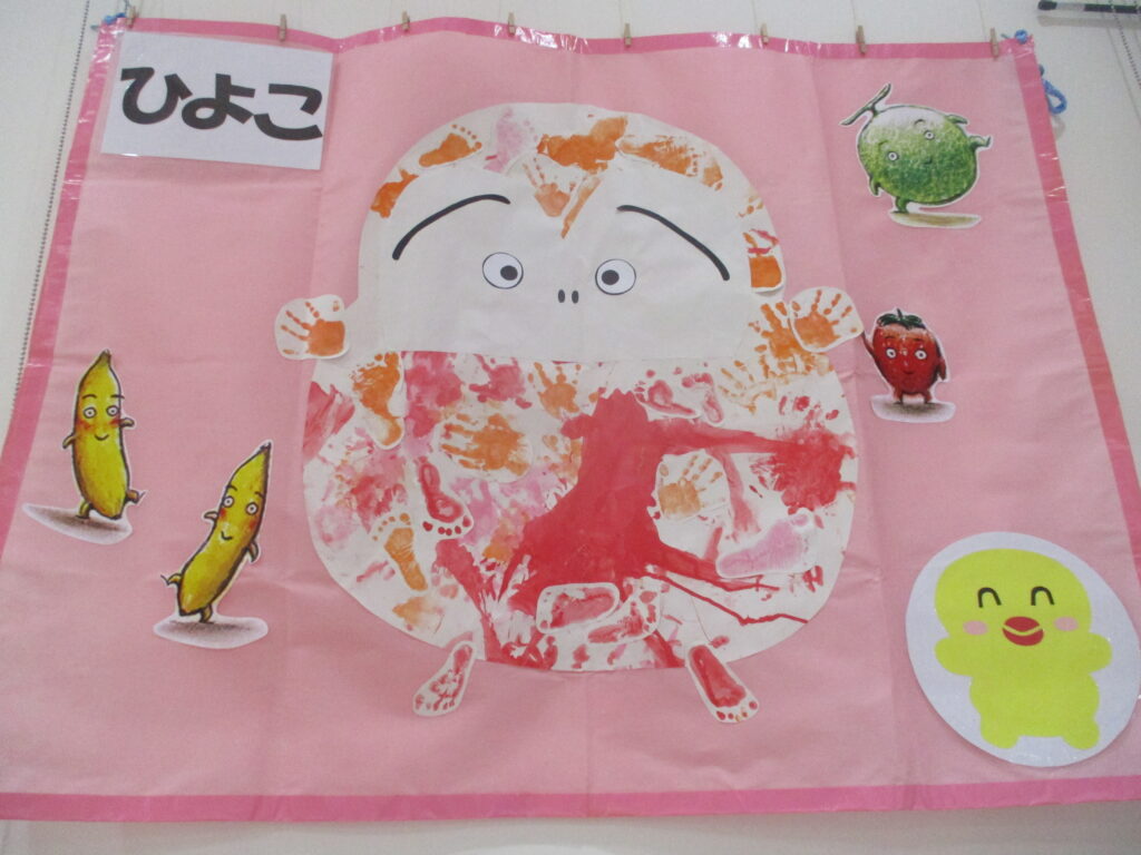 0歳…ひよこ組の応援旗は、子どもたちが大好きな絵本『だるまさん』にしました!夏に楽しんだ絵の具遊び。手や足で絵の具をペタペタ。初めての感触に戸惑う子、紙をバンバン叩いたり踏んだりして色付けを楽しむ子、自分の身体に塗ってみる子…と様々な姿が見られました。月齢の低い子も足型で参加!とってもかわいいだるまさんができました♡