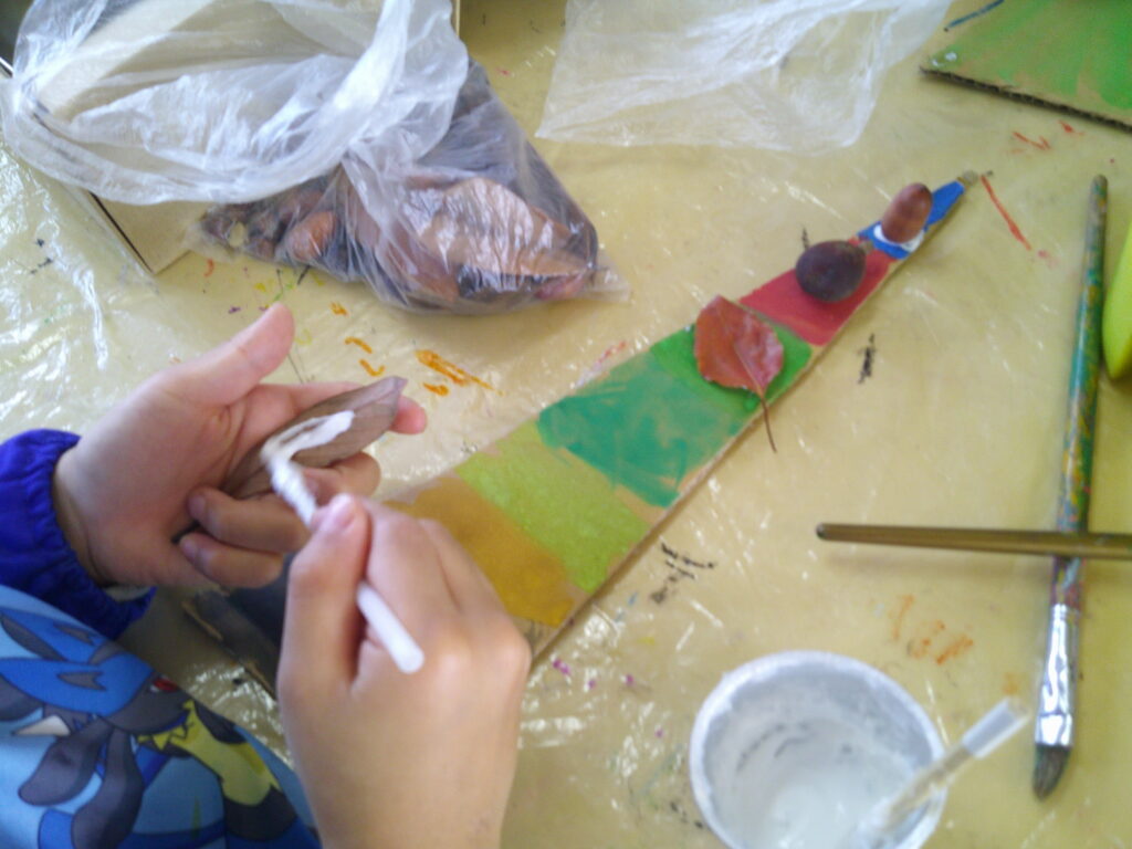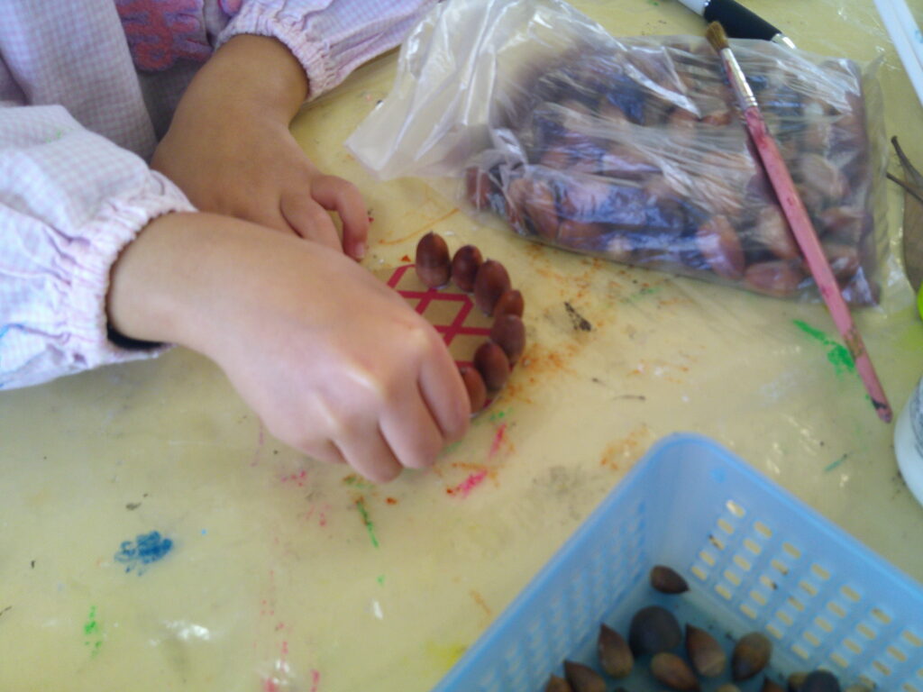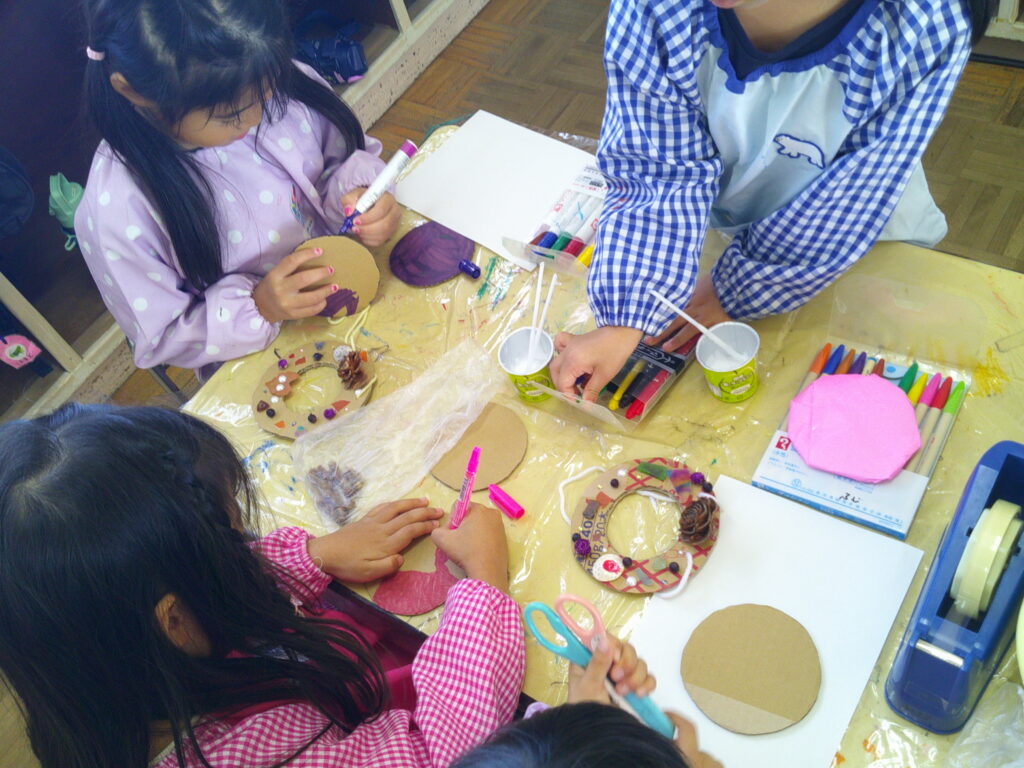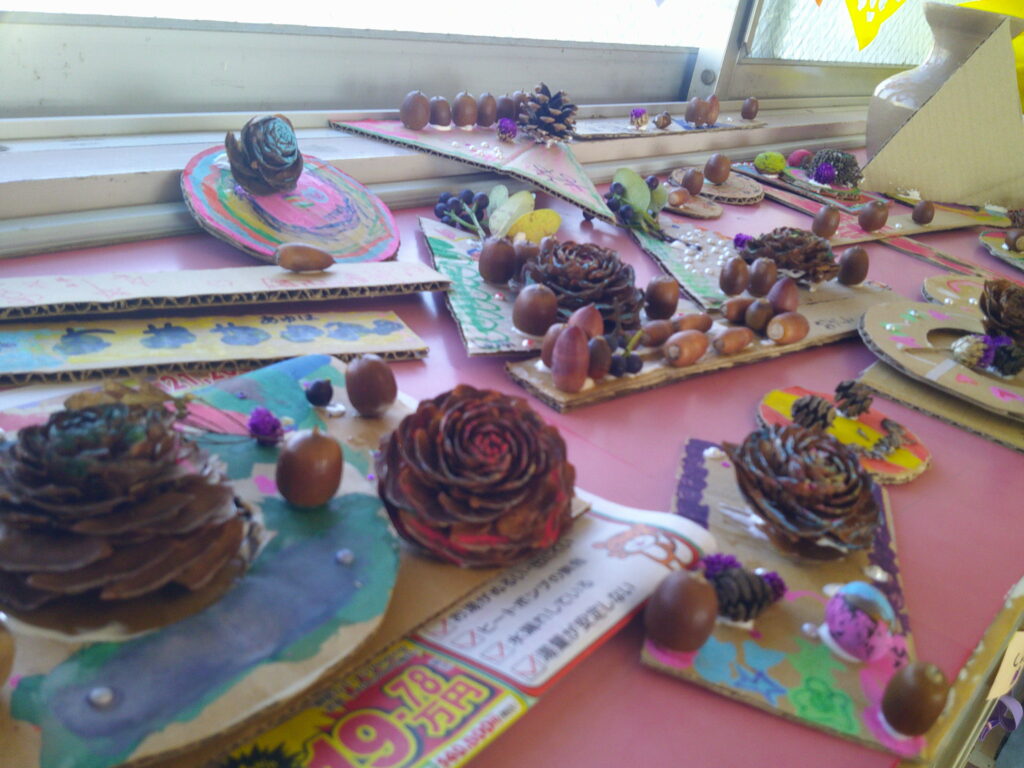 秋の自然物を使って製作を行いました。どんぐりや木の実、松ぼっくりなどから好きな素材を選んで、素敵な作品が出来上がりました。
