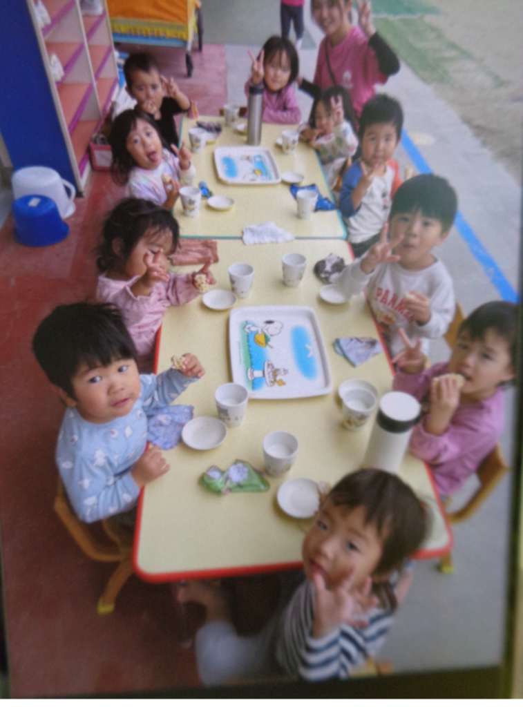 夏の暑さもなくなり、ちょうどいいお天気の時に子ども達から「おやつそとでたべたいよ~」という声があり、テラスでおやつを食べる事に!テラスに机を並べると「やった~^^」とすぐに手を洗い準備を始める子ども達。ぽんこめばーと牛乳を飲食しながら「きもちいいね~」と嬉しそうにしていました。