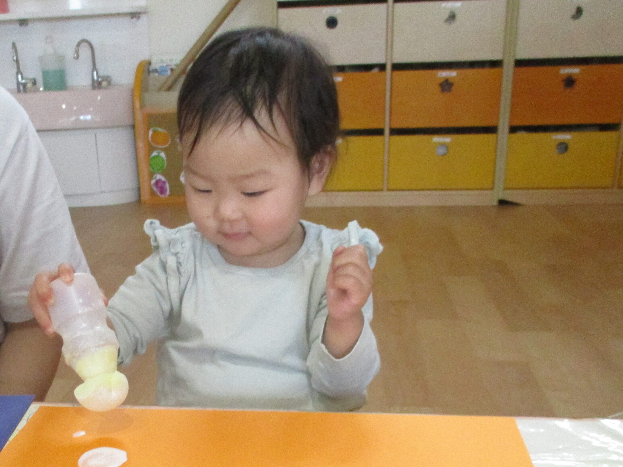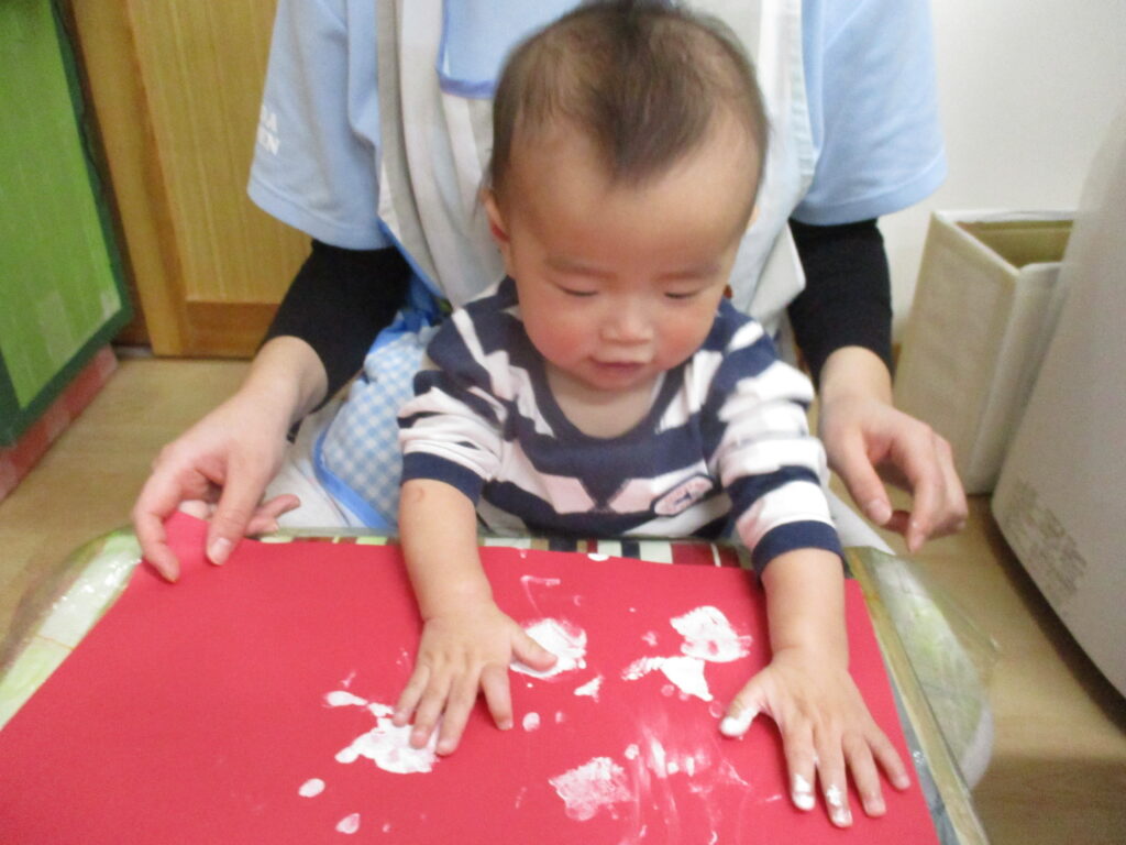 月齢の低い子は手や指を使ってペタペタ♪感触や手に付いた色を見て不思議そうにしながらも、嫌がることなく楽しむことが出来ました!
