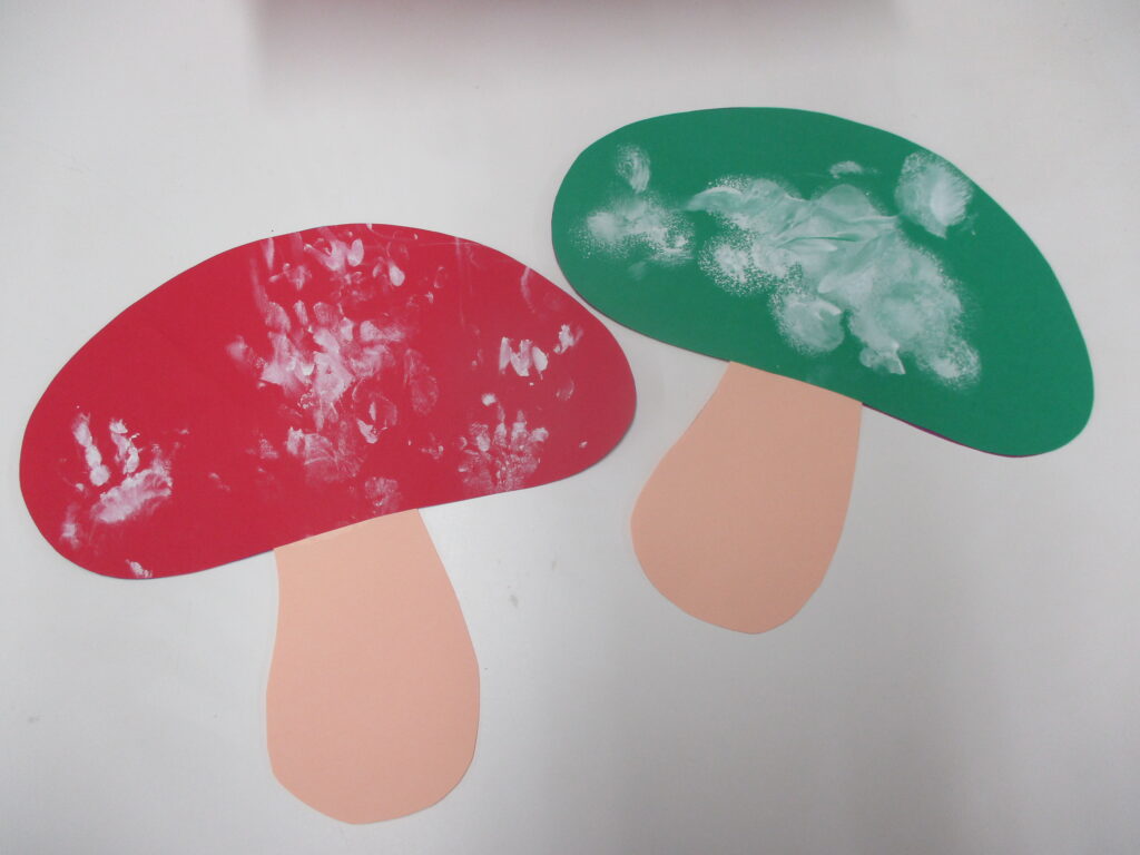 完成したきのこを見て、「あー!」「ん!ん!」と指さし嬉しそうな子どもたち。毎日歌っているきのこの歌も、もっと楽しくなりそうです♡
