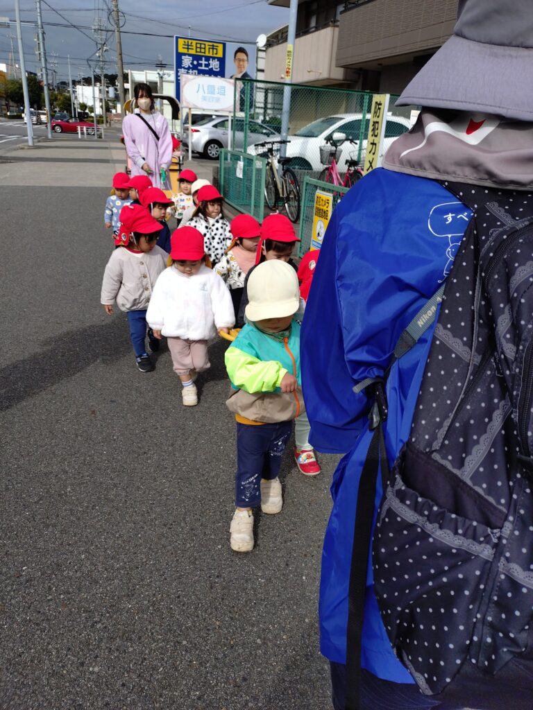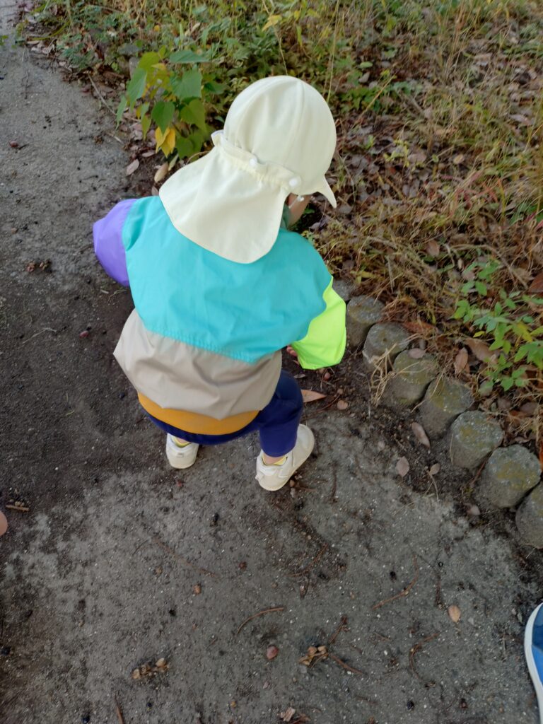 秋の風がふき、落ち葉が見られるようになり、一時保育のぱんだ組も近くの成岩中学校までお散歩に行きました!誘導ロープというお散歩の時の輪のついたロープを持って、行きも帰りも歩いていくことができたぱんだ組さん。落ちているどんぐりに興味津々で夢中で拾い続けていました。