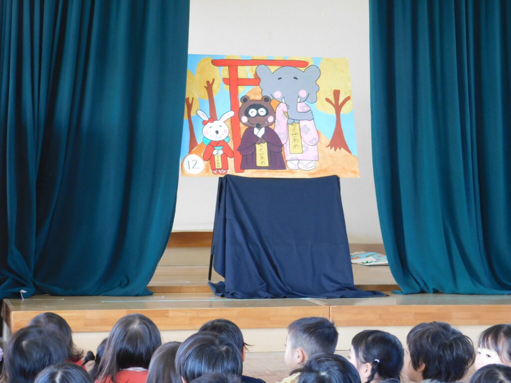 11月生まれの誕生会を行いました。名前を呼ばれると元気よく「はい!」と返事をし舞台の前に出てきた7名の誕生児。写真撮影では全員「ハイ、ポーズ💕」で笑顔で撮影できました。11月15日の七五三前日と言う事で先生たちが大型紙芝居「七五三おめでとう」の読み聞かせしてくれました。みんな興味津々、真剣に見いってました。子どもの健やかな成長を祝う行事です。男の子は5歳(3歳で祝うことも)女の子は3歳と7歳でお祝いをします。また、七五三に食べる千歳飴について「千年長生きできますように」という願いが込められており、飴の色も縁起の良い紅白と教えてくれました。