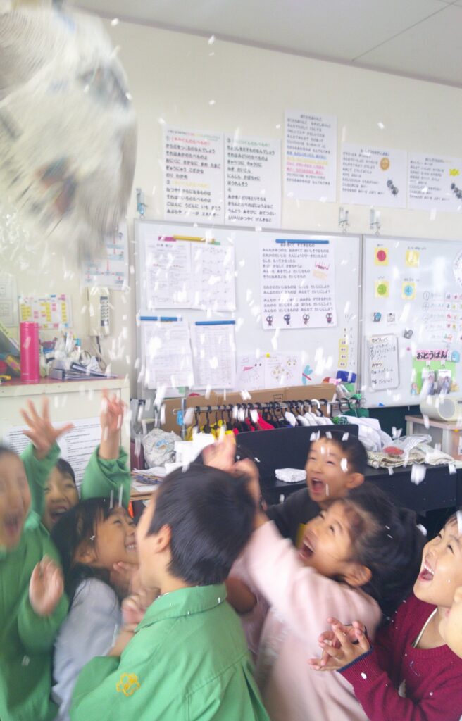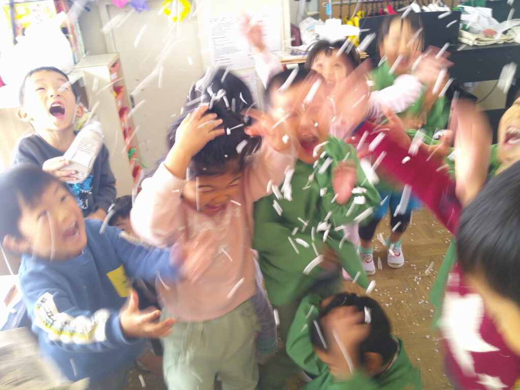 先週、緑組に一足早い冬が訪れました。保育者が上から発泡スチロールの雪を降らせると、子どもたちは目を輝かせて見上げ、「雪だ!雪だ!」と大喜び😊口を開けて雪を受けようとしたり、「ゆきやこんこ~♪」と歌い出したりと、冬の雰囲気を楽しんでいました。その後は「えーい、それ!」とお友達同士で雪をかけ合い、全身が雪だらけになるほど大盛り上がり!