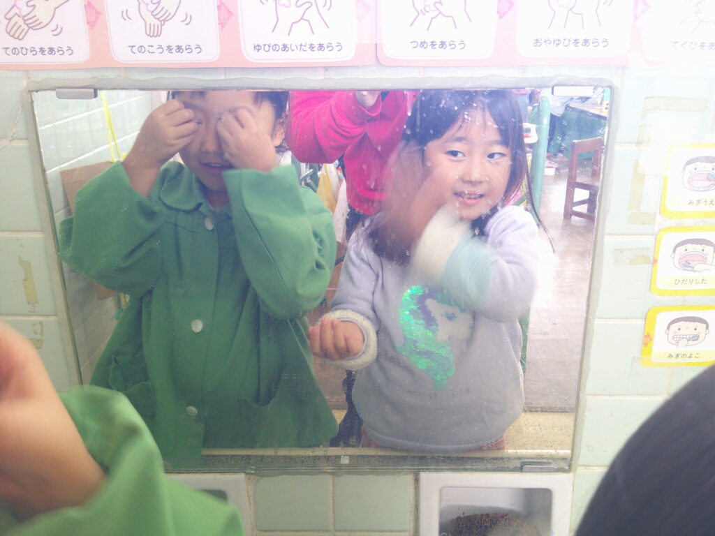 クライマックスには、みんなで新聞紙に雪を集め、保育者がそれを上から降らせると、子どもたちは再び「きゃーー!!」と大歓声。目を輝かせながら、降り注ぐ雪を思いっきり楽しんでいました⛄最後は列に並んで順番に雪を拾い集めたり、手洗い場の鏡を見ながら体に付いた雪を一つ一つ取ったりして、一足早い冬を楽しみました❄
