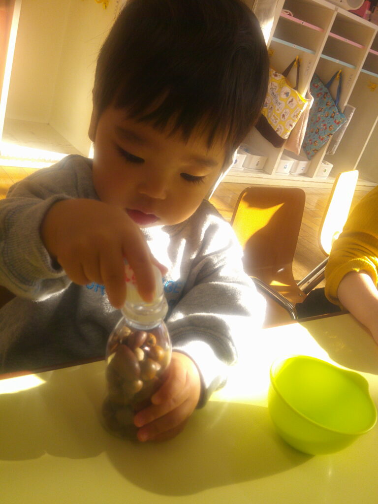 どんぐりが容器に入ると、蓋を閉めマラカスを鳴らし楽しんだ後は、蓋を開けどんぐりを出し