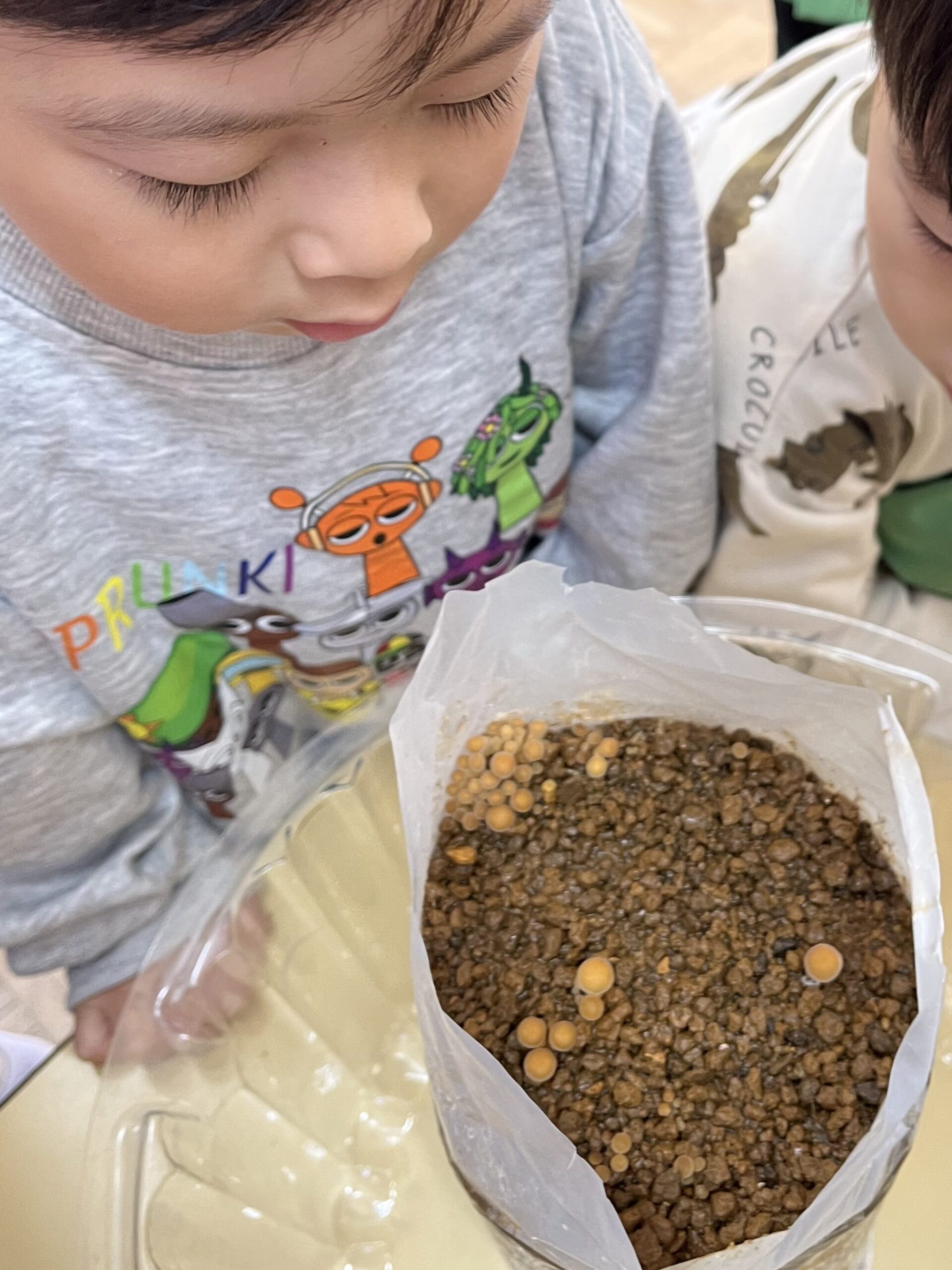 毎日みんなで交代して、霧吹きで水をあげています。1番早く生長したのは、たんぽぽ組のしいたけ!豆乳バター醤油をつくっておすそ分けしてもらいました♡ なかなか出てこない、すみれ組とつくし組さんのきのこ。そんな中3週目にして、つくし組さんのしめじが出てきました。現在すくすく生長中!いったい、すみれ組のえのきはどうなってしまったのか。説明書には「2~4週間で育ちます」と書かれていましたが、4週目の今週に入っても一向に生えてこない株を見て、諦めかけていたその時!26日㈬の朝見てみると、ぴょこぴょこ!っと顔を出しているではありませんか✨保育者が感激して「みんな!!えのきの赤ちゃん出てきたあああ!!」と叫ぶと、「えー!みせてー!!」と集まってきて、嬉しそうに見ていたみんな。「みんなが水やりしてくれたからだね。よかったねぇ❤」と喜び合いました。