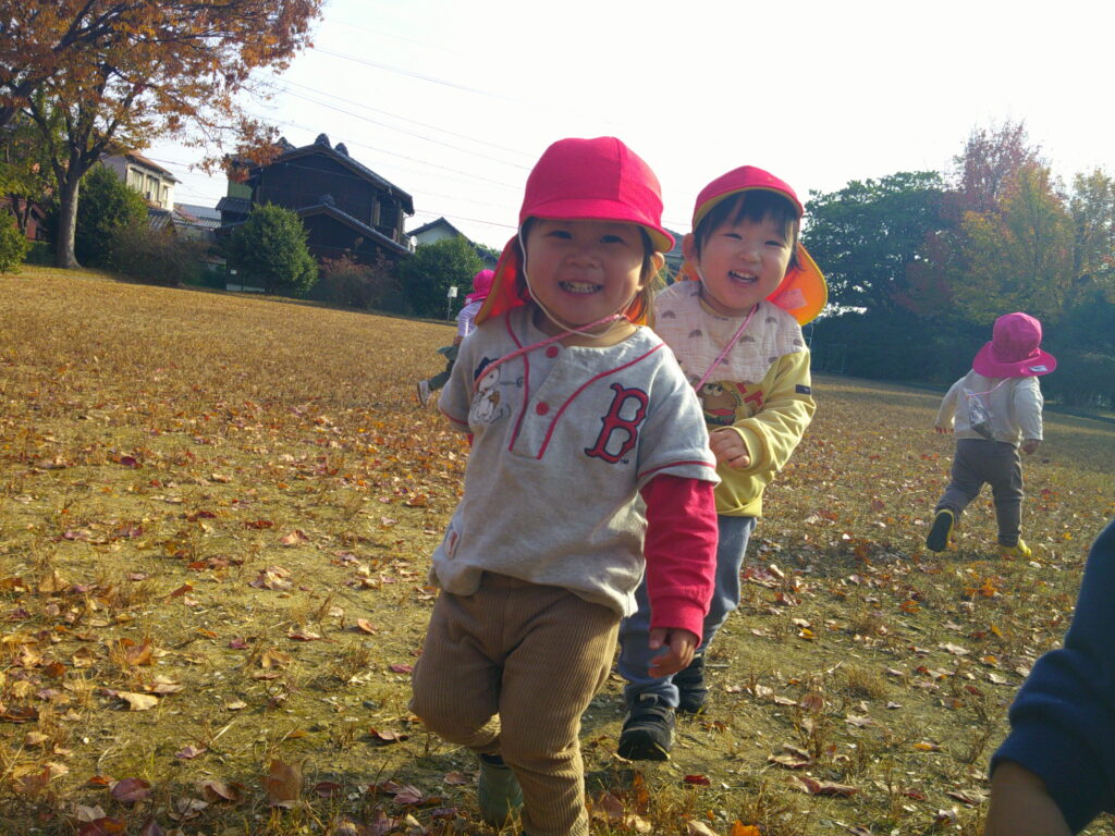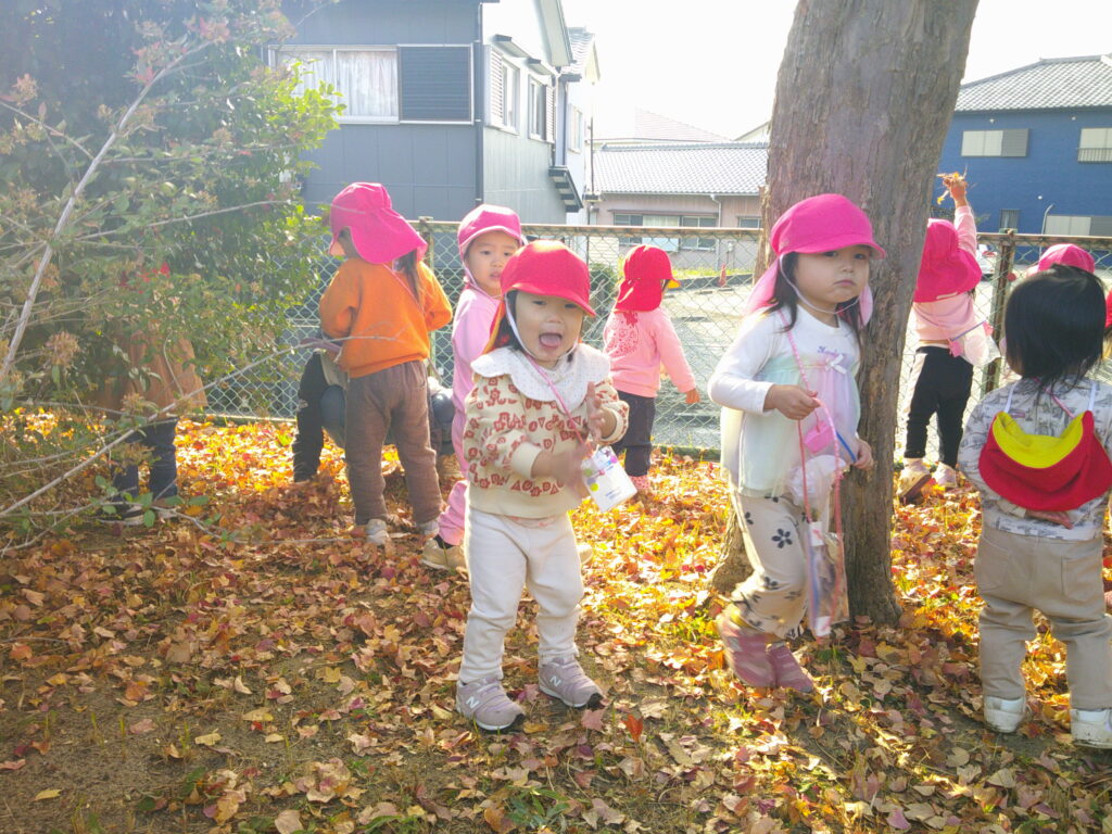 最近の散歩では、2歳さんと中蓮公園や花園小学校に行きました。お散歩バッグをもってどんぐり拾いを楽しんだり、落ち葉のじゅうたんや両手いっぱいに葉っぱをもって落ち葉のシャワーを楽しみました😊