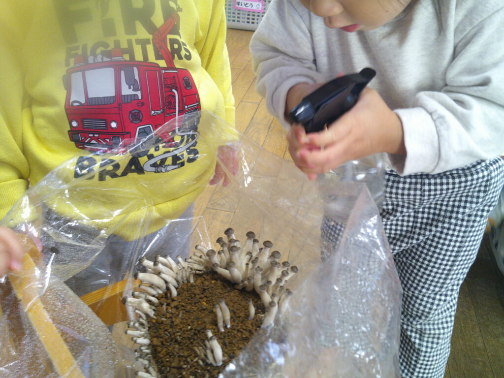 匂いを嗅いだり、魔法のお水で、いちご組のしいたけとしめじは愛情たっぷりです‼