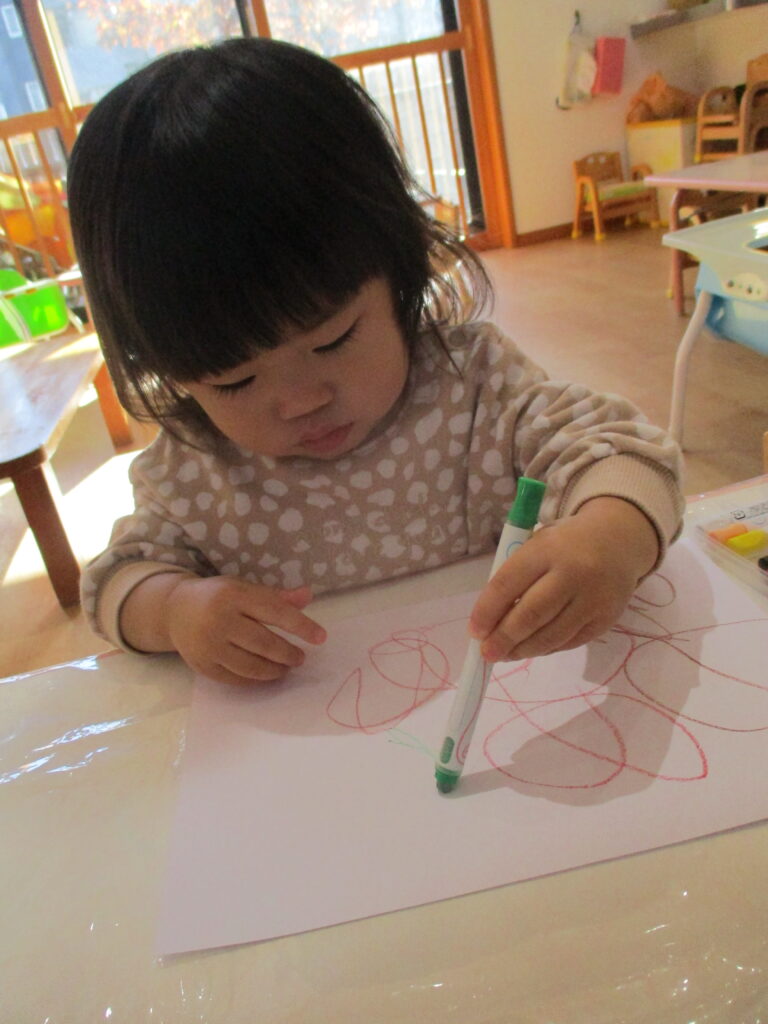 ひよこ組で初めてなぐり書きをしてみました!色の出やすい、柔らかいクレヨンを使っていざ挑戦!