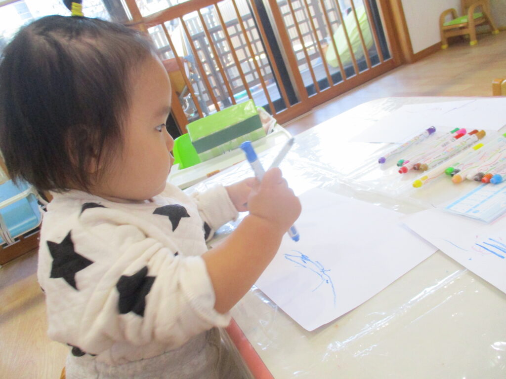 描けた線を見てパチパチ拍手をし合ったり、「あか!」「り~!(みどり)」など色の名前をお喋りしたりとやりとりも楽しみました✰またやろうね!