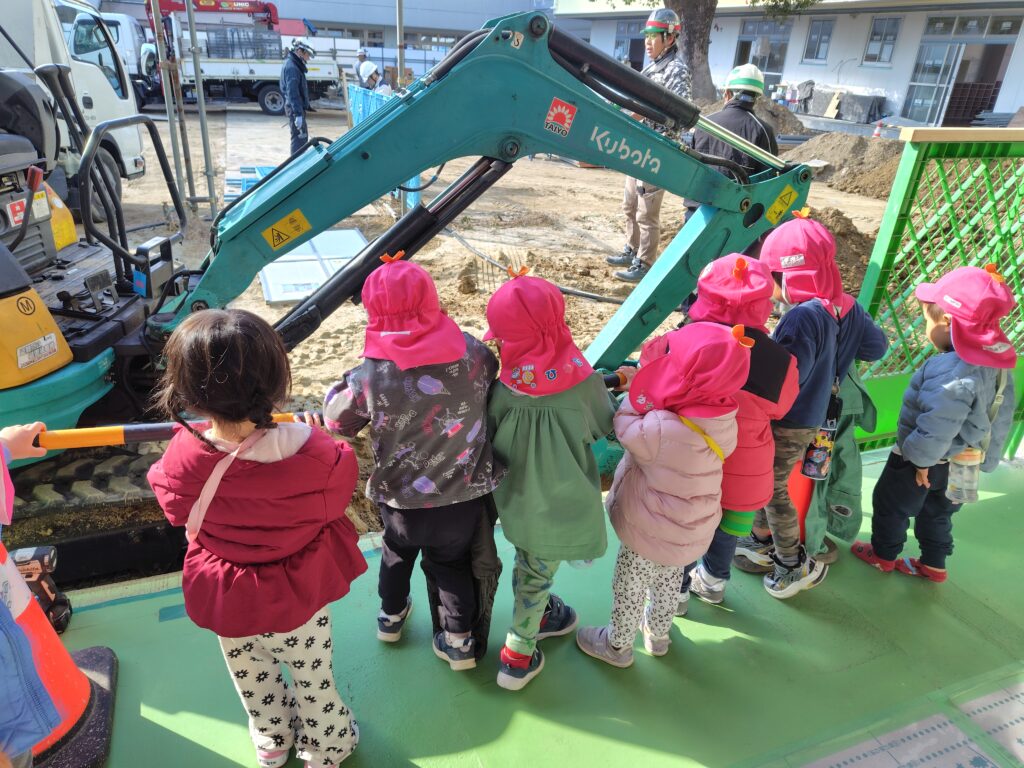 先日、戸外遊びを終えお部屋に戻る時、なんとお部屋の前にショベルカーが止まっているではありませんか!「見て!!ショベルカー!!」と大興奮で教えてくれたC君。ほかの子も「うわー✨」と集まってきました。こんな近くで見られる機会もなかなかないと思い、みんなでショベルカーの見学会をすることに😊