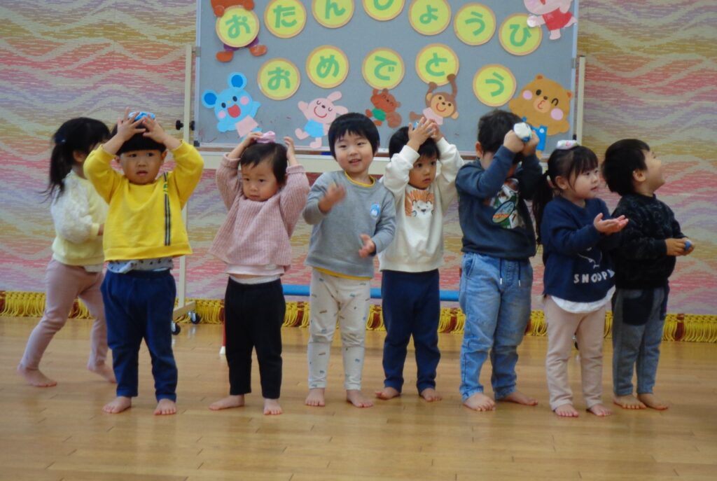 1月生まれの誕生会を行いました。今回は元気な2歳児(うさぎ組さん)が始めの手遊びを披露してくれました。お手玉を使った「ぺったらぺったん」というわらべうたです。かわいい手にお手玉を持ち「ぺったらぺったん!」とペタペタ。最後は神棚へ・・・頭にのせ、「今年もたくさんお米がとれますように…」とお願い。最後は頭を下げるとお皿にした手にポトン!お願い叶うかな? それから、誕生児のお披露目。元気な2歳のお返事を真似て、1歳児の子も元気にお返事。ハッピーバースデーを歌ってもらってご機嫌でした。