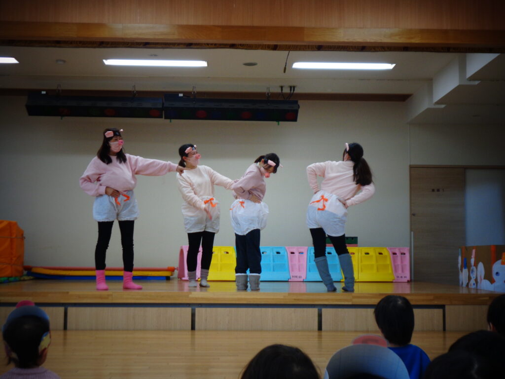 今月の出し物は、「パンツのはき方」子ぶたに扮した職員が買ってもらった新しいパンツに大喜び。でも、はき方がわからず困っていると、先輩子ぶたが教えてくれました。「ぱんつはね~・・♪」で始まる『パンツのはきかた』の曲に合わせて、一緒に履いて見せてくれましたよ。上手にはけたと思ったら・・・残念! 前後が逆でした。子どもたちも心配そうに見ていましたが、パンツをはけて嬉しそうな子ぶたの様子にホッとした様子でした。