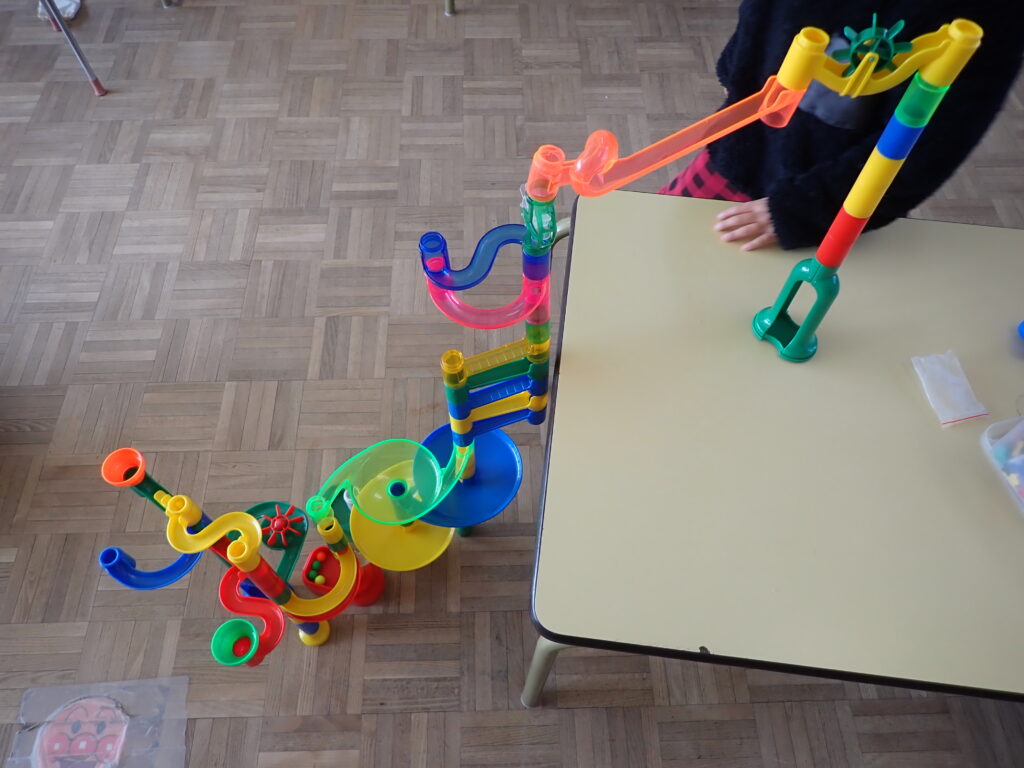 様々な形のレールを組み合わせて色々なコースが作れるのですが、最初は思い思いにレールをくっつけ、なかなか最後までたどり着かなかったり、逆にボールの通る穴が続き真下にボールが落ちたりしていました。