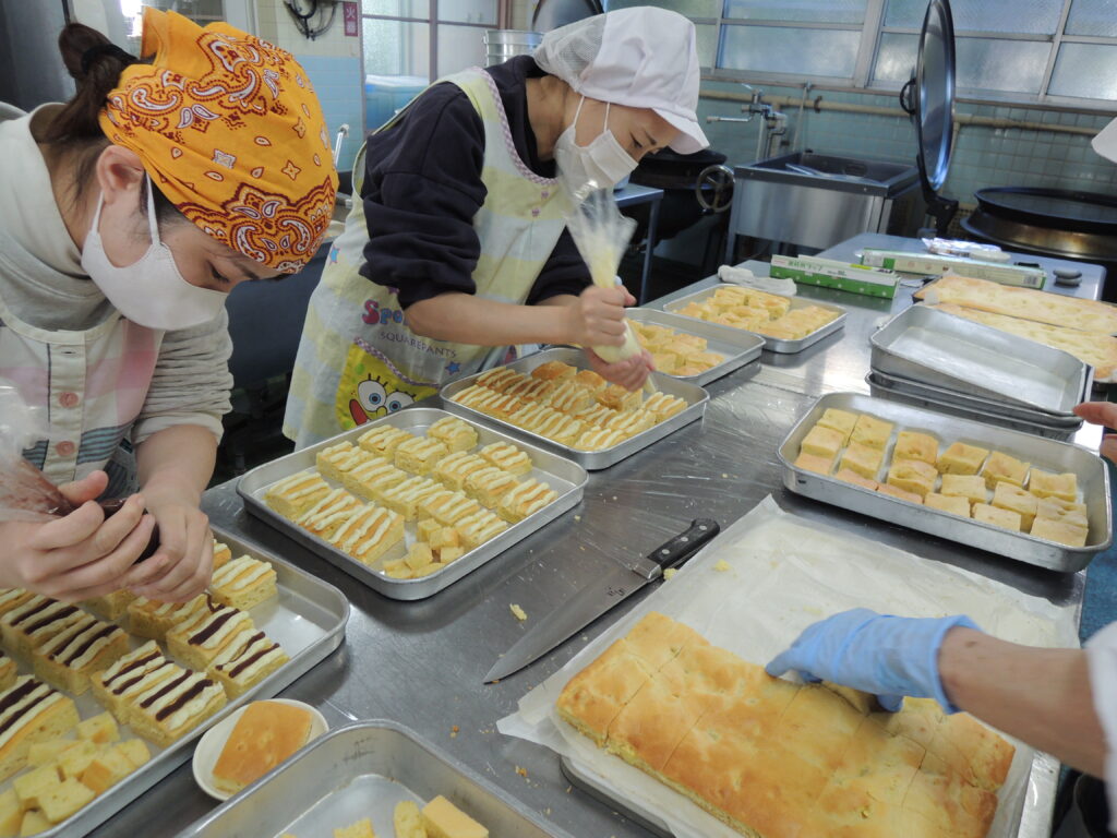 先生たちにも手伝って頂き、鬼のパンツ模様になるよう、こしあんとさつまいもクリームでデコレーションしました(*^^*)