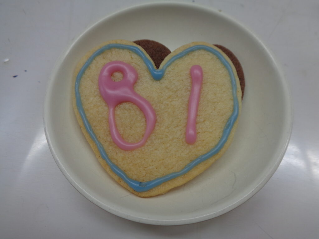 2月11日は同胞園の設立記念日です!設立記念なので、何か特別なおやつにしよう!という事で、おやつにクッキーを焼きました。81周年のお祝いなので、クッキーに「81」とアイシングしました!