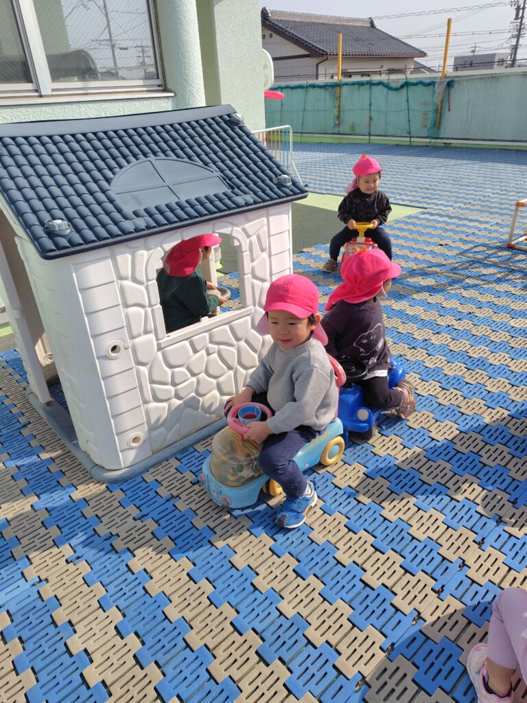 二階にある乳児テラスでプラ乗用に乗って遊んでいるとN君がお家をドライブスルーに見立てて遊び始めました。「ポテト🍟くださーい」というとすかさずJくんが「いらっしゃいませー!」と店員さんになりきりお家の中から顔を出しました。その様子を見た他の子どもたちが面白そう!とすぐさま参加し大人気のドライブスルーになりました😊