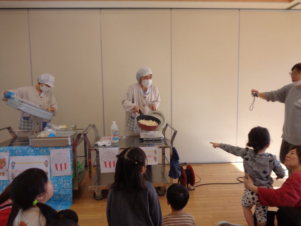 本園では1才さん、2才さん、ぱんだ組さんに実際にポップコーンを作っているところを見ていただきました(^^♪