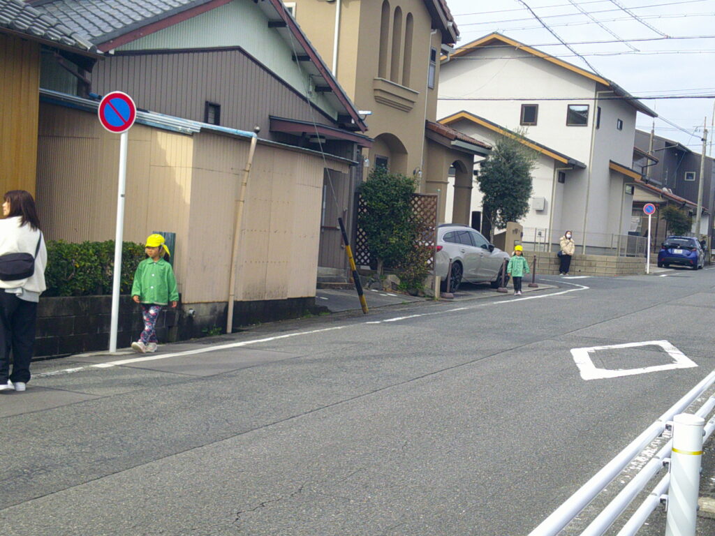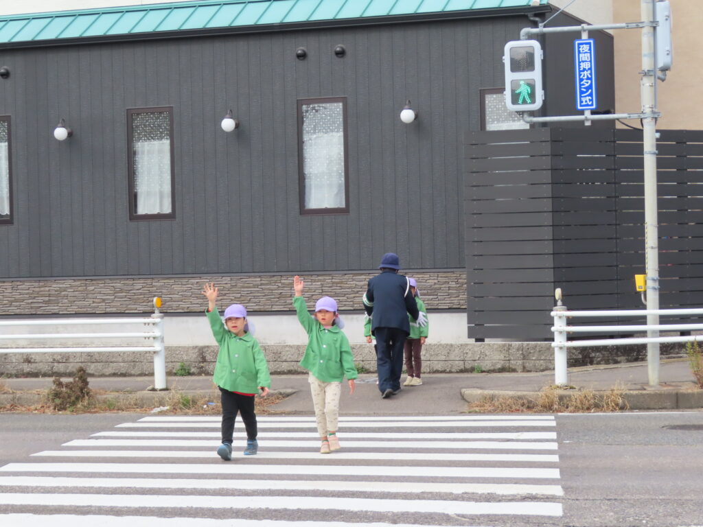 指導員さん、年長児保護者の方々に見守られながら、園舎西門前からはさま公園をぐるりと周り、信号機のある大通り3か所を横断。その後、園舎南門に向かい横断し園舎西門に戻ってくるコースです。き組から一人ずつ間隔をあけて出発です。どの子も真剣な表情で少し緊張しながら歩いていました。信号機を見る目もいつも以上に見つめ「みぎ・ひだり・みぎ・信号よし!」手を高く上げ少し急ぎ足で渡る子どもたちでした。参加して頂いた保護者の方から「一年生になっても大丈夫と安心しました。」と褒めていただき、子どもたちも嬉しい気持ちになり、いつもの笑顔😊になりました。事故や怪我もなく無事に終えることができ本当に良かったです。