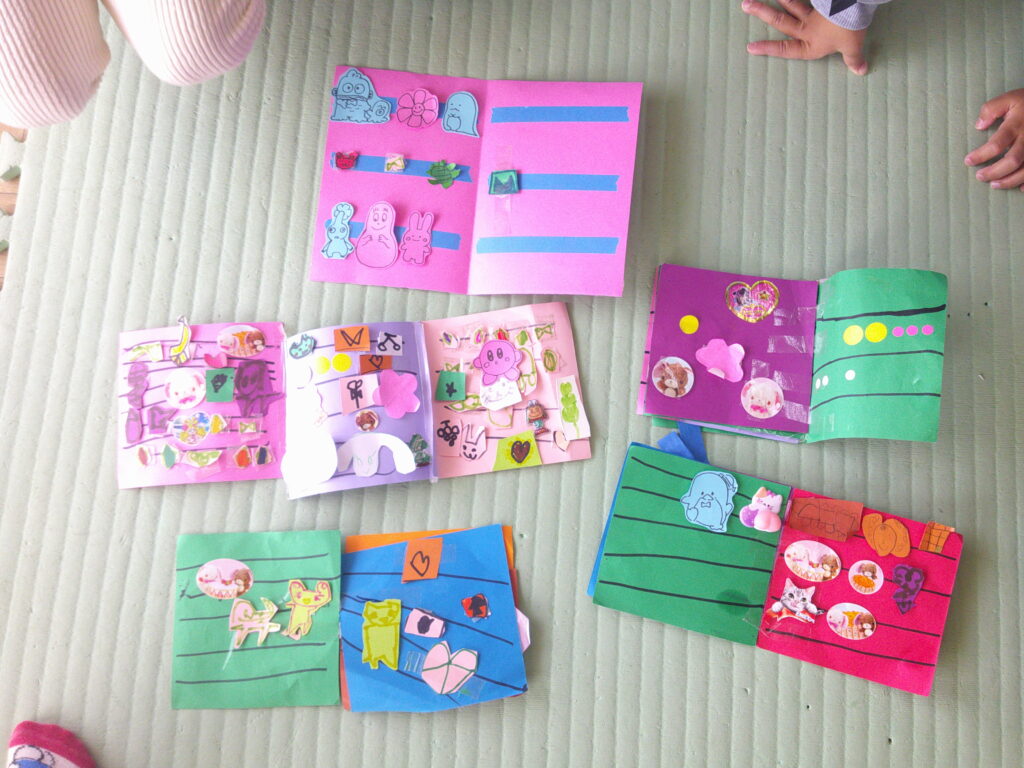 年長さんがシール帳を作っている様子を見て、目を輝かせていた年中さんたち。「先生、シール帳を作りたい!」という一言をきっかけに、シール帳作りが始まりました。子ども達は画用紙に好きな絵を描いたり、空き箱に描かれている猫や犬のイラストをハサミで丁寧に切ったり、それを一人ひとりのシール帳にセロハンテープで貼り付けて、オリジナルのシールを作っていきます。朝の支度を終えるとすぐに集まり、「このシール可愛い、欲しいな」、「Aちゃんからもらったシールはあげれないけど、これならいいよ」といったやりとりが自然と広がりました。友だちとの会話を楽しみながら交換を重ね、気づけばたくさんのシールが集まりました。年長さんへの憧れがきっかけとなり、とても楽しい遊びへと繋げることが出来ました。