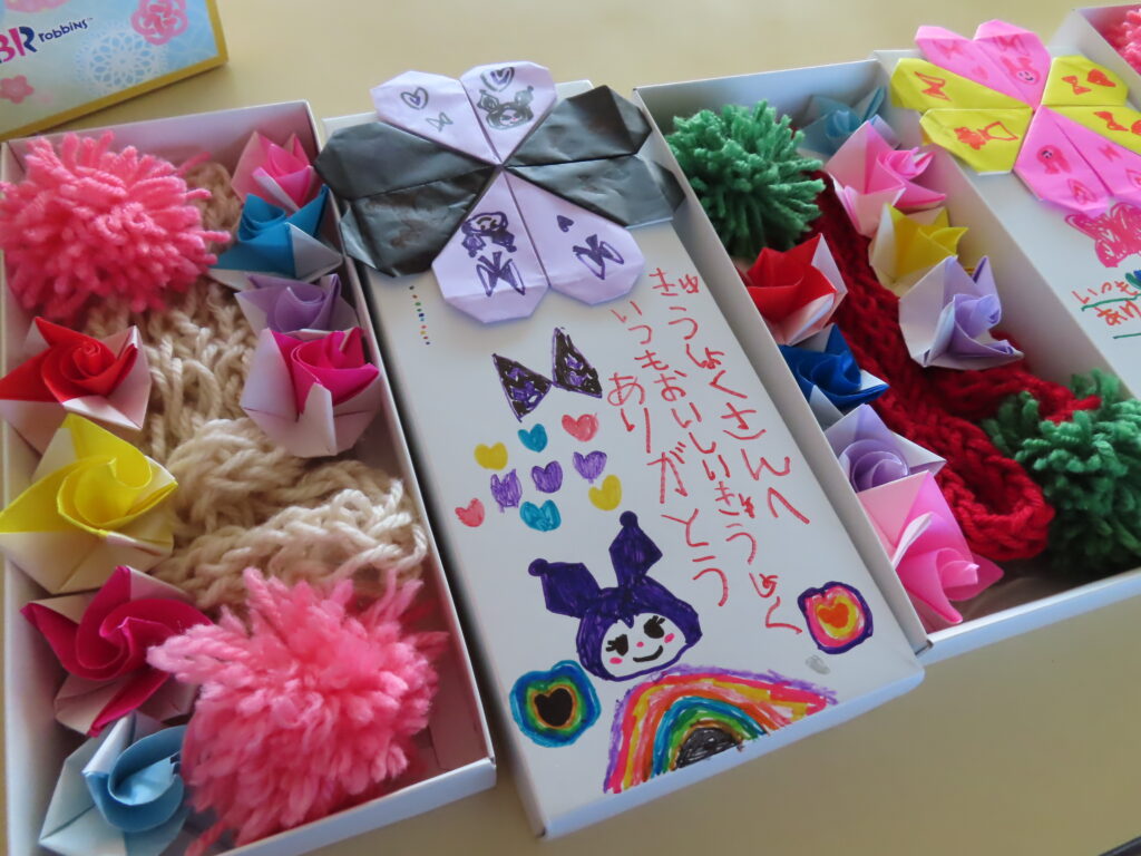 年長も残りわずかとなりました。今までお世話になった方々にお礼をしよう!ということになり、給食さん、早延長の木庭先生、お昼に見て下さるまゆみ先生、まこと先生、畑の野菜などでお世話になった市野さんにプレゼントを作りました。思い出を色々語りあいながら、指あみマフラーや折り紙の花を作ったり色紙にお礼の言葉を書いたり・・・。一生懸命作っている姿を見て、成長を感じ、嬉しくなると同時に寂しさも感じました。本当に大きくなったね。先生たちは誇らしいです!!