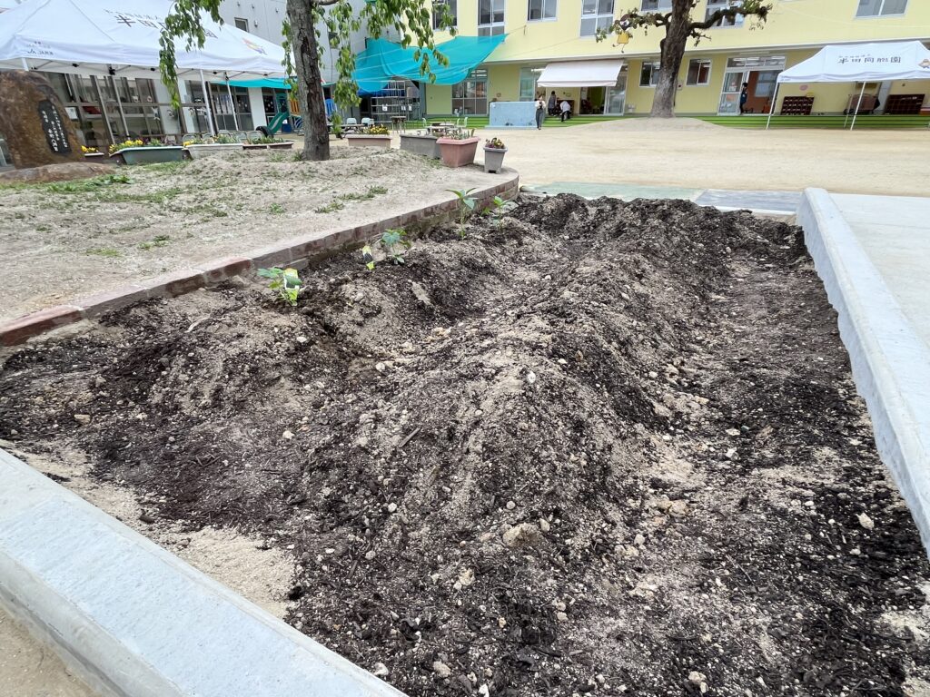 年長、年中が野菜(きゅうりなど)を育てるため畝作りから始めました。これから水やりや草取りなどみんなで育てていきたいと思います。