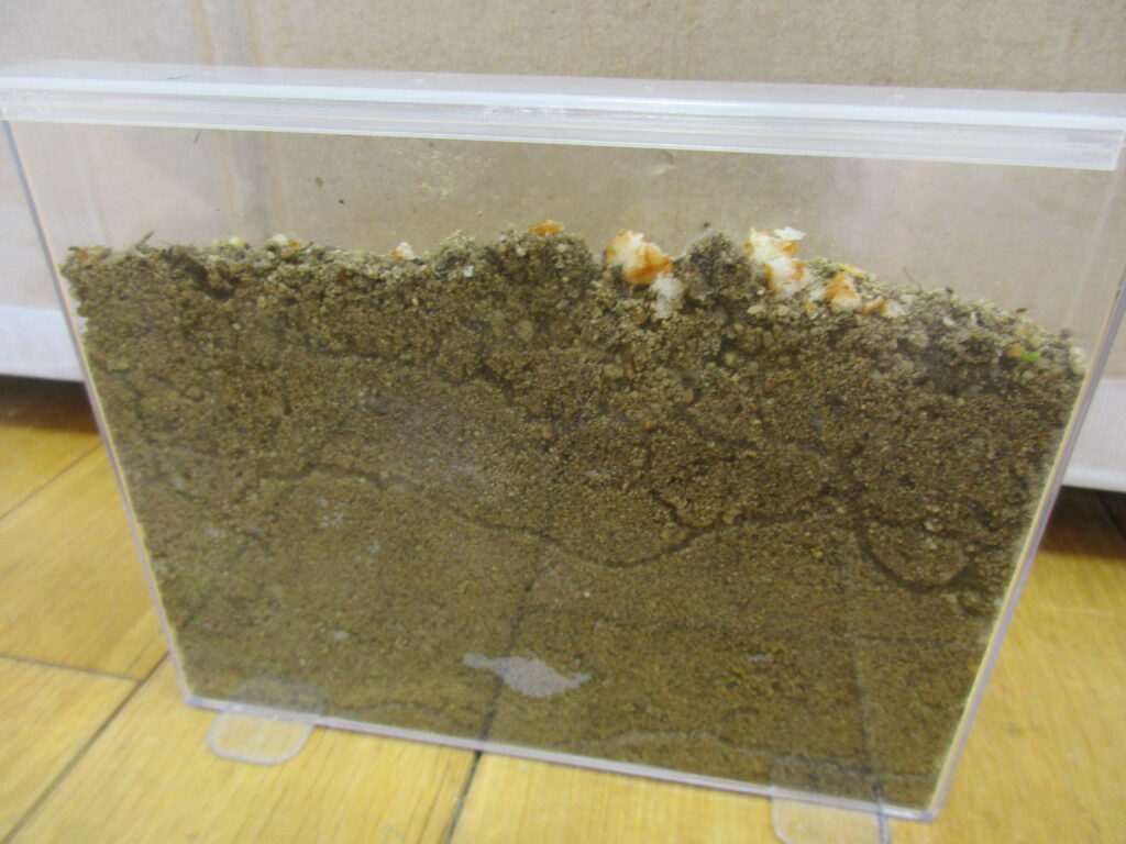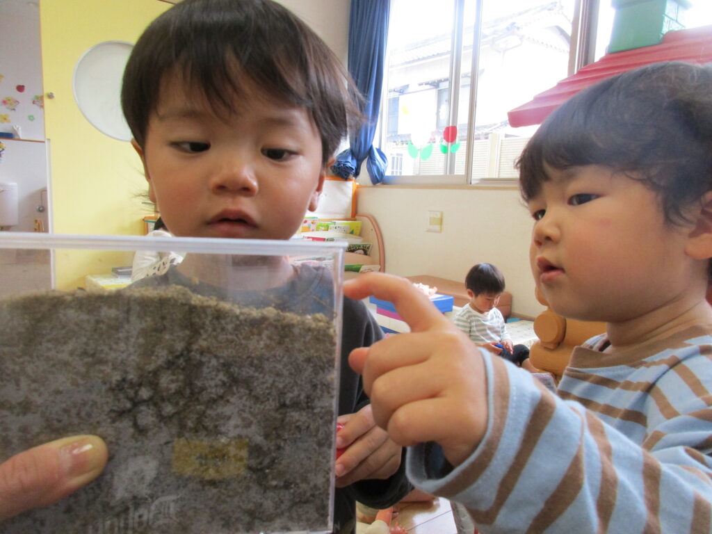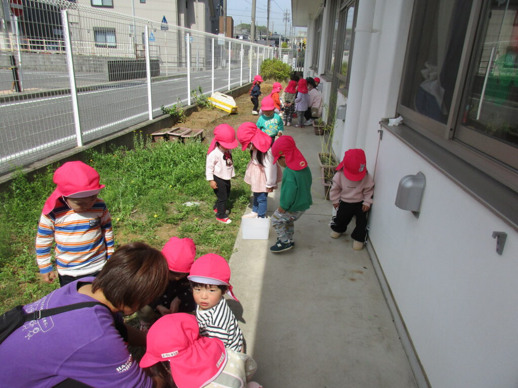 こあら組には特別な庭があります!保育室北側にある「にじ畑」。時々、その特別な庭に遊びに行きます。皆のお目当てはダンゴムシ!プランターの下や土を掘って探します!次々捕まえ容器へ。数日間、大切に観察し、また土へ返しました。クラスの中には沢山の虫好きさんが居て、他にも園庭にやってくるアゲハチョウを見つけて喜んだり、小さなアリを捕まえて観察容器に入れて、どの子も興味津々でアリの巣観察。先日のおやつで出たポン菓子や、おせんべいの食べ残しをみんながアリにお裾分け♡アリたちがお菓子を一生懸命に運んでいる様子を夢中で観察する可愛い子どもたちです!夢中になりすぎるあまり、お口からよだれが垂れてしまうなんてことも…(笑)